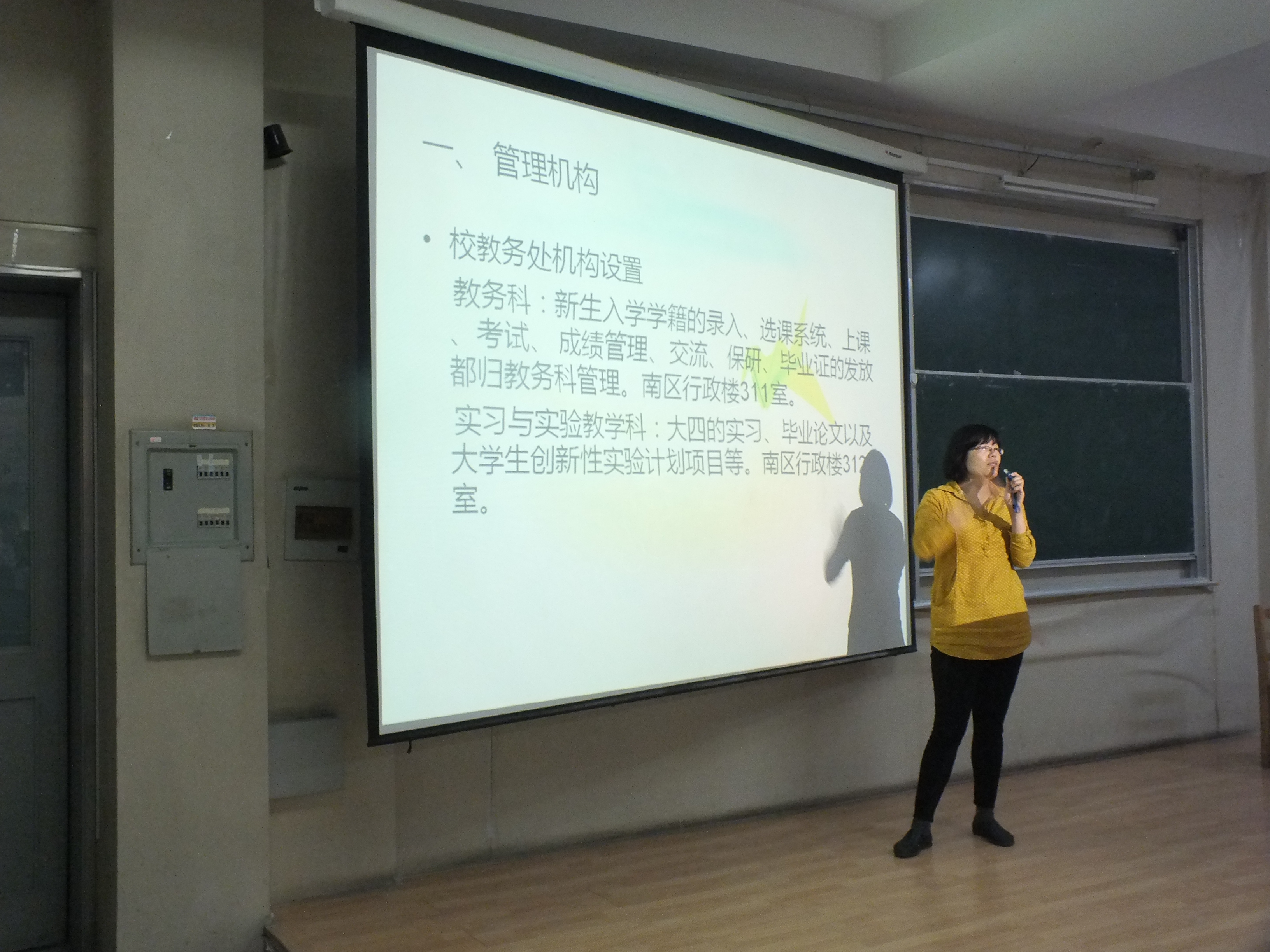 曲文娜老师就学校和学院的本科生教学管理机构设置向大家作了简要介绍,指出新生首先要了解大学的精神,以全面的视角认识大学的理念、功能,作好自我定位,在学习生活中要明确自己的学习目标,既不要盲目乐观也不要随波逐流;新生同学们还要注意转变学习方式方法,增强自主学习能力,适应大学的启发式教育模式。