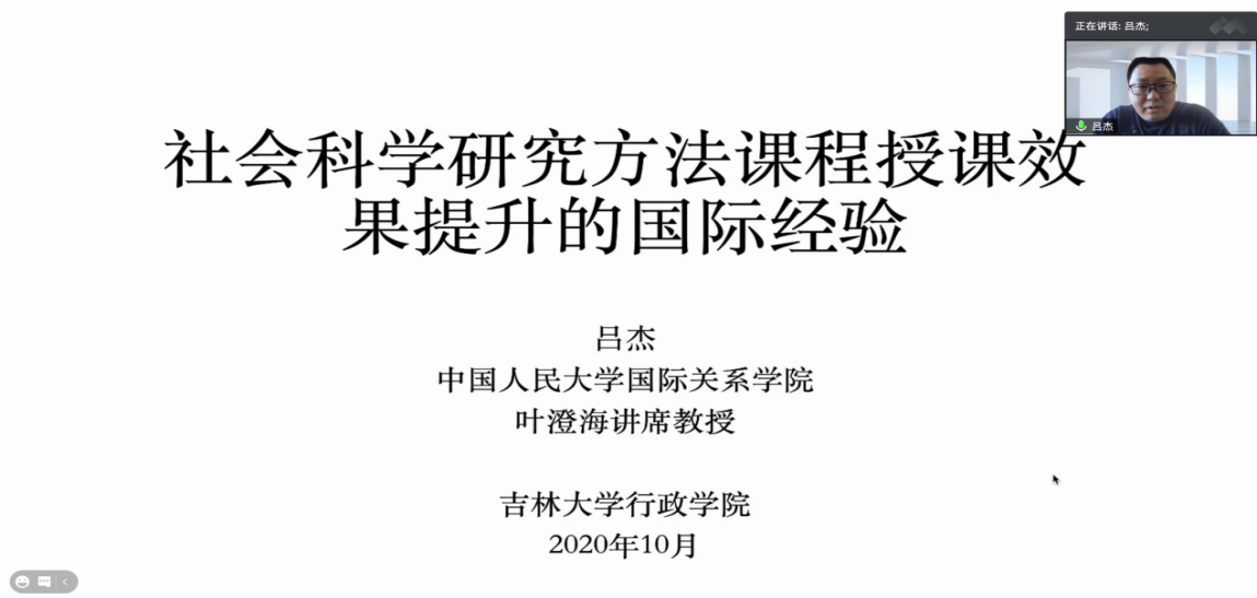 2020年10月23日下午,吉林大学行政学院主办的第四期教师教学能力提升助力计划讲座在腾讯会议平台举行。中国人民大学政治学系教授,中国人民大学叶澄海讲席教授吕杰老师作了题为“社会科学研究方法课程授课效果提升的国际经验”的讲座。