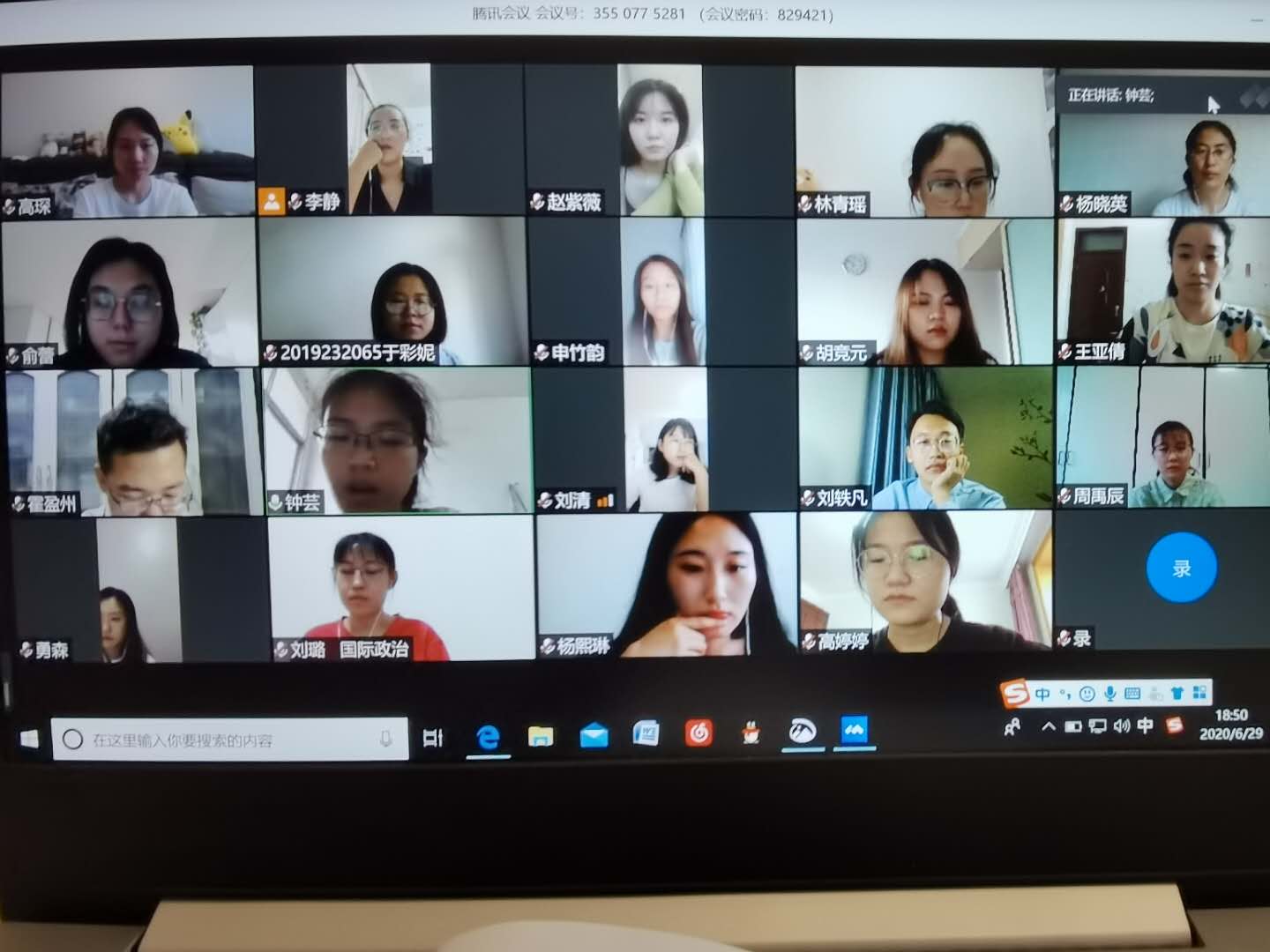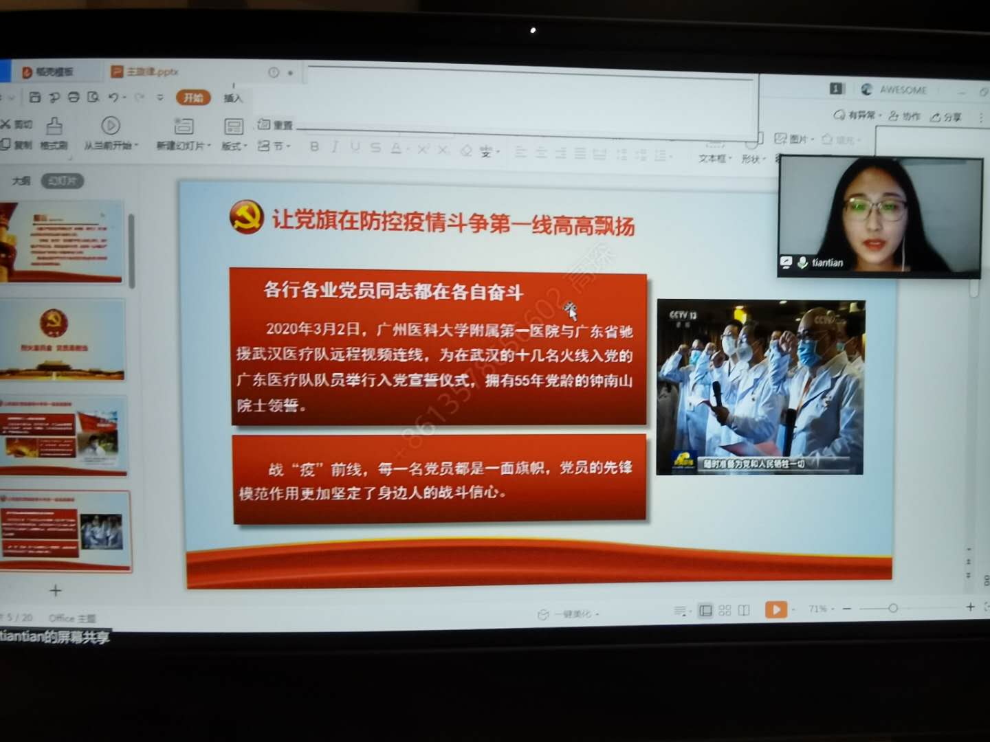 以“迎党的生日·讲战疫故事·悟初心使命”为主题的“七一”专题组织生活会率先召开,党员同学们一起畅谈了发生在自己身上的、身边的战疫故事。接着,在霍盈州同学的领誓下,全体党员同学举起右拳,面对屏幕上的党旗一起重温了入党誓词。