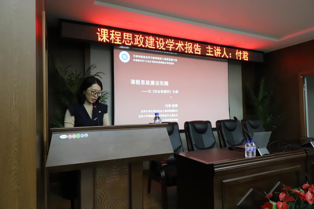 2021年12月1日,行政学院争做新时代“大先生”研究生教师素养提升系列活动——课程思政建设学术报告于东荣大厦B303报告厅开展。本场报告邀请了吉林大学生物与农业工程学院副院长、博士生导师付君教授作为主讲,以《农业机械学》为例分享了生物与农业工程学院课程思政建设经验。报告由学院党委副书记史慕华教授主持,学院研究生导师及部分职工参加报告会。