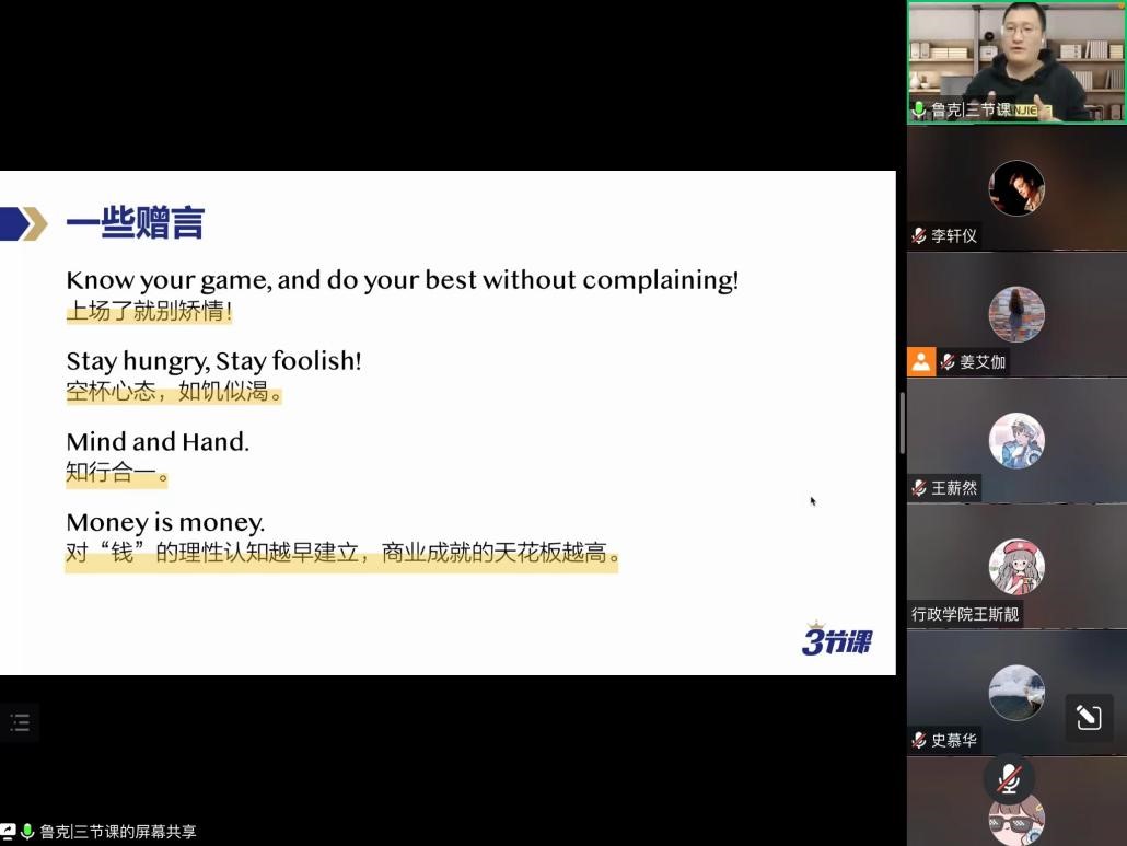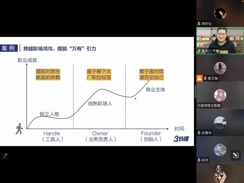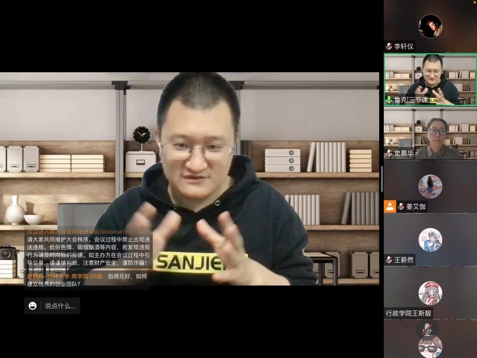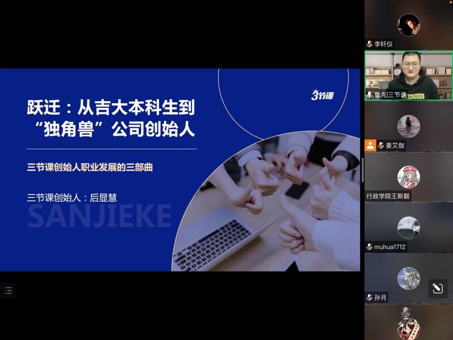 2022年4月15日晚,由吉林大学行政学院主办的“职业能力提升计划”系列活动在腾讯会议平台进行。此次活动邀请到三节课创始人兼CEO、中国传媒大学客座教授后显慧,做客腾讯会议室,为学生们作题为“跃迁:从吉大本科生到‘独角兽’公司创始人”的职场创业经验分享报告。学院党委副书记兼院长、纪委书记张洁、团委负责人孙月、外事秘书王斯靓以及行政学院百余名学生参与此次报告会,行政学院党委副书记史慕华主持活动。