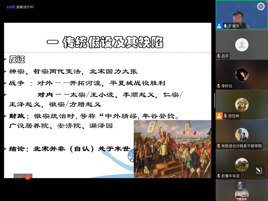 本次学术讲座兼具历史感与创新性,既具有学术价值又富有启发意义。通过此次学习,同学们对北宋的战略失败原因有了更加深入的了解,纷纷表示此次讲座对于开拓研究思路大有裨益,并对于海洋教授深厚的研究积淀与学术造诣感到敬佩。在疫情防控的特殊时期,希望同学们能够通过学术活动以史明鉴,了解新的学术分析视角,激发学术创造力,增添学术思想的厚度!