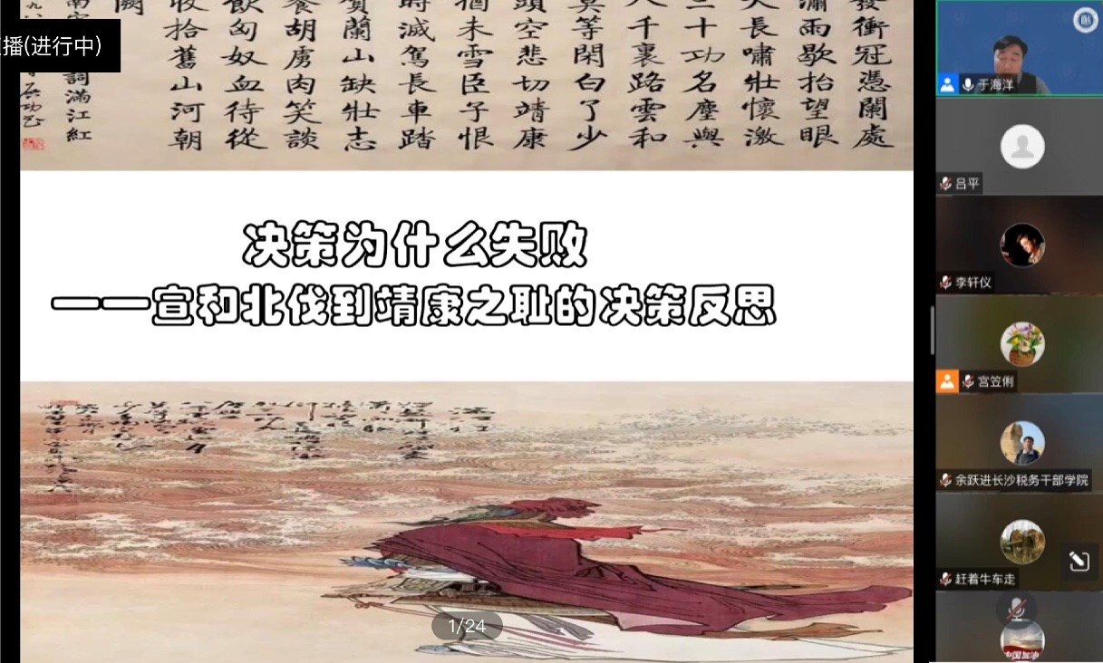 讲座开始,于海洋教授采用先破后立的论证方式,首先介绍了中国传统史论中对于宣和北伐决策失败的三种解释,即变法乱政说、决策失误说、执行失败说,认为这三种传统假设的解释力不足且均存在缺陷,并不能完全反映出宋徽宗朝战略决策的复杂历史背景,难以解释整个决策和实践过程。因此,于老师认为,后人由果推因的总结并不能对当时军事和外交决策做出切实反思,需要引入新的理论工具重新探讨宣和北伐的决策过程,有助于对宣和时代的宋金关系进行有价值的分析。