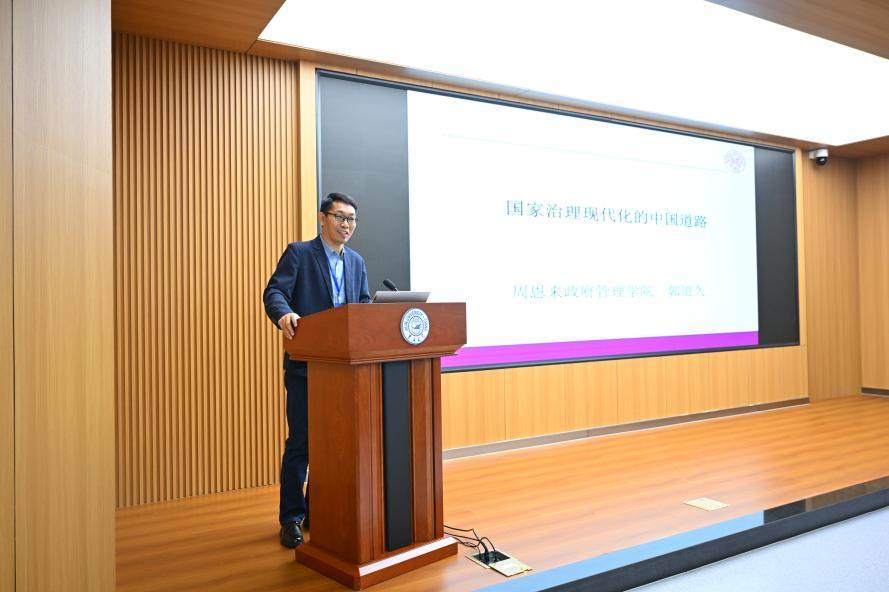 论坛开幕式结束后,南开大学周恩来政府管理学院副院长郭道久作了题为《国家治理现代化的中国道路》的主旨报告,吉林大学行政学院教授薛洁担任主持人。郭道久在国家治理现代化的背景下,对中国特色社会主义治理体系进行了深入剖析。他强调了人民中心的方法论与党的领导核心地位的本质特征,并指出要充分发挥国家与社会的积极性。在此基础上,郭道久创新性地提出了常态与弹性治理的双轮驱动治理模式,为我国治理体系和治理能力现代化提供了新的思路和方向。