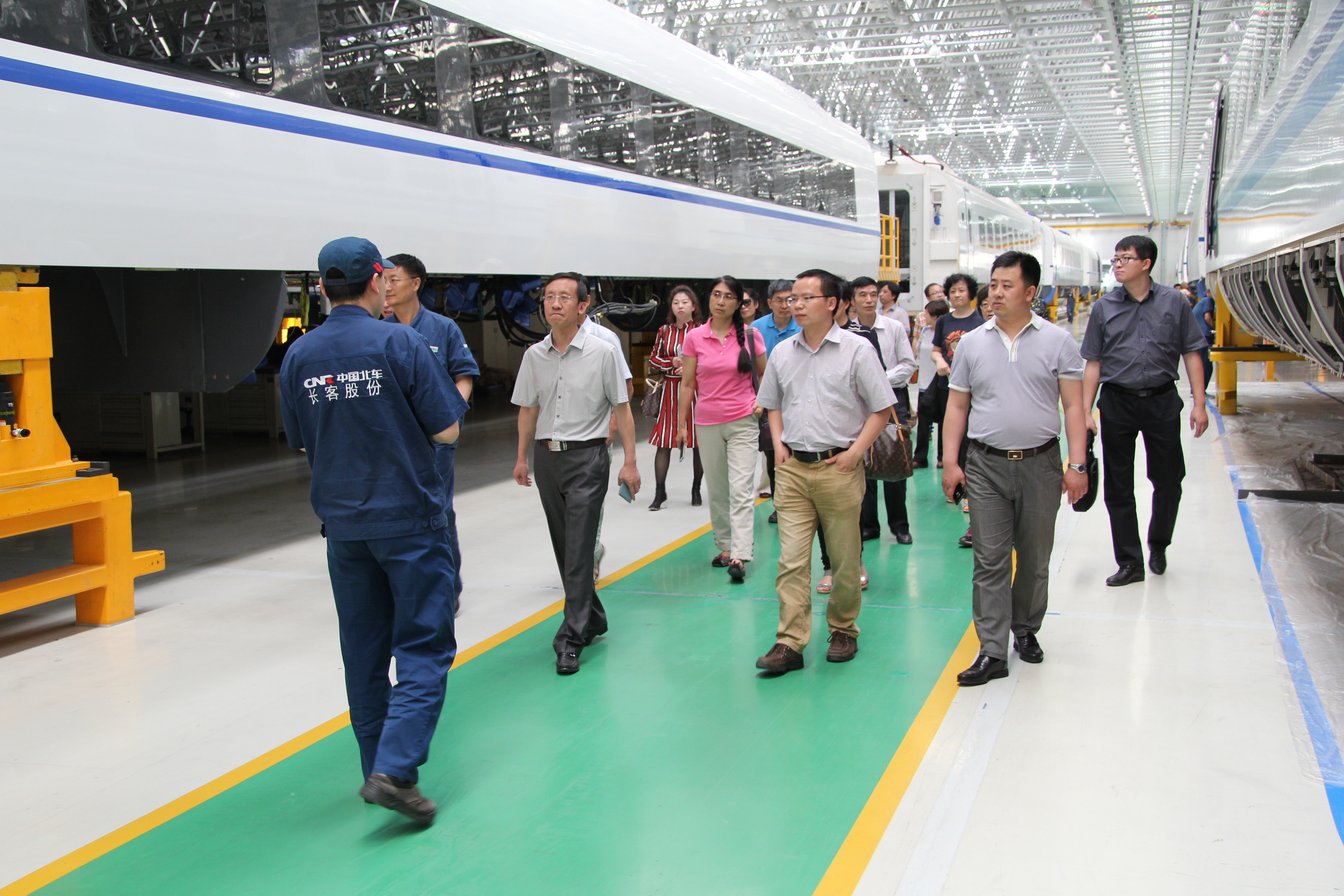 14时许,大家乘车到达位于绿园经济开发区的长春轨道交通装备制造业基地后,映入眼帘的是一排排整齐崭新、宽敞明亮的厂房,教职工们兴致勃勃的跟随厂方工作人员走入车体生产车间。骆云龙副总经理对国产高速铁路客车的生产流程、生产工艺、技术参数、安全性能以及国内外同行业技术工艺的发展比对进行了详细讲解。在总装车间,我们看到了一列列正在组装的高铁车组,月产13列车组的壮观场面让我们震撼,车间主任对复杂的装配工序进行了讲解,也对中国高铁在短期内,从技术引进到消化吸收、再发展成为具有世界领先的独立知识产权的奋斗历程进行了简要介绍,我们对中国在短期内高铁客车的快速发展而震惊,为长客人的奋斗精神和聪明智慧而骄傲。