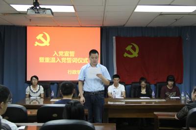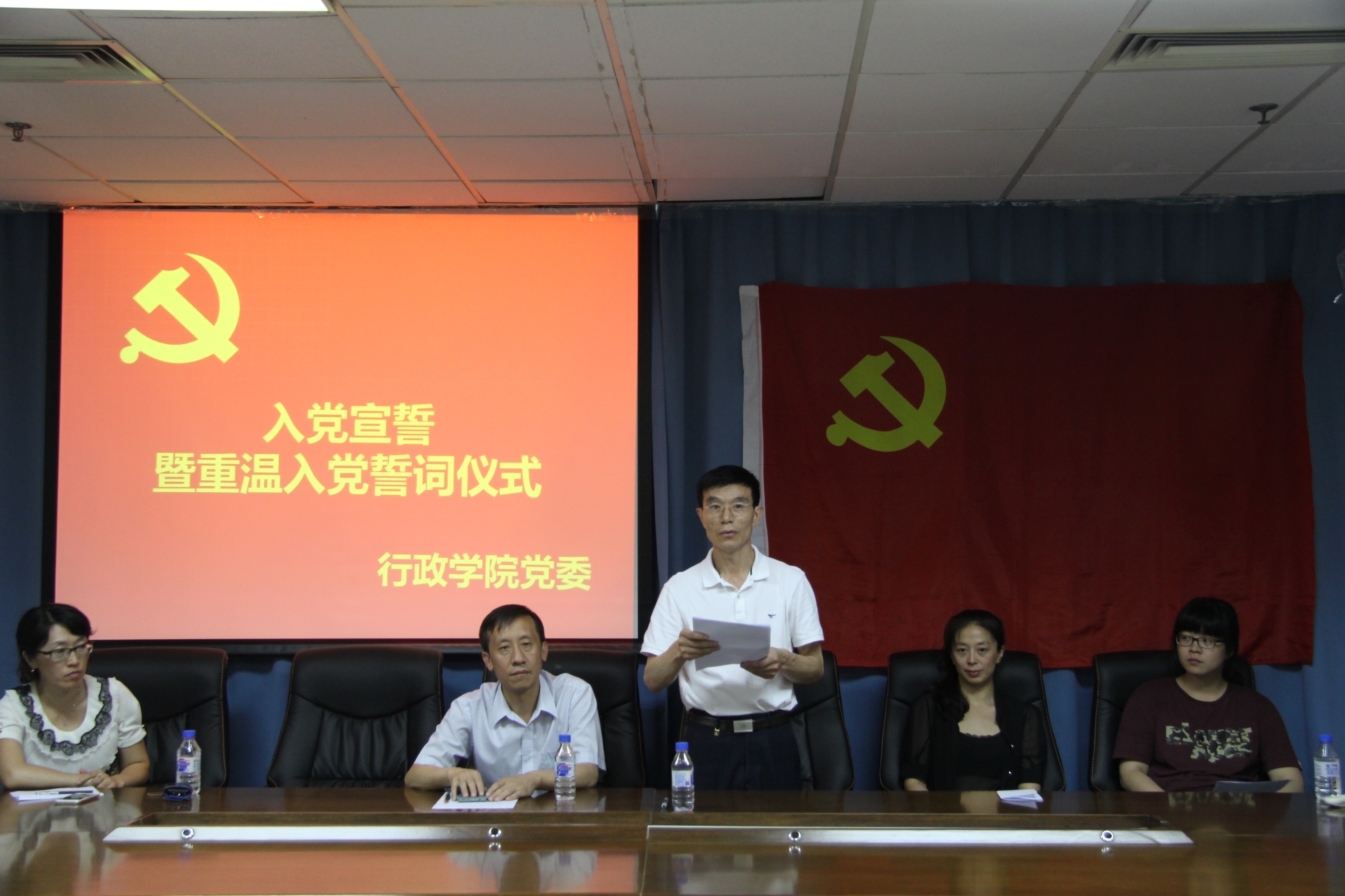 为庆祝中国共产党成立94周年,增强新老党员的责任感和使命感,2015年6月26日,吉林大学行政学院党委于吉林大学前卫南区东荣大厦511会议室举行了入党宣誓暨重温入党誓词仪式。行政学院党委书记边铁,党委副书记常有余、党委副书记兼副院长史慕华,研究生秘书邵薪运、本科生辅导员曲畅竹出席了此次会议,学院的新老学生党员参加了此次仪式。会议由史慕华主持。