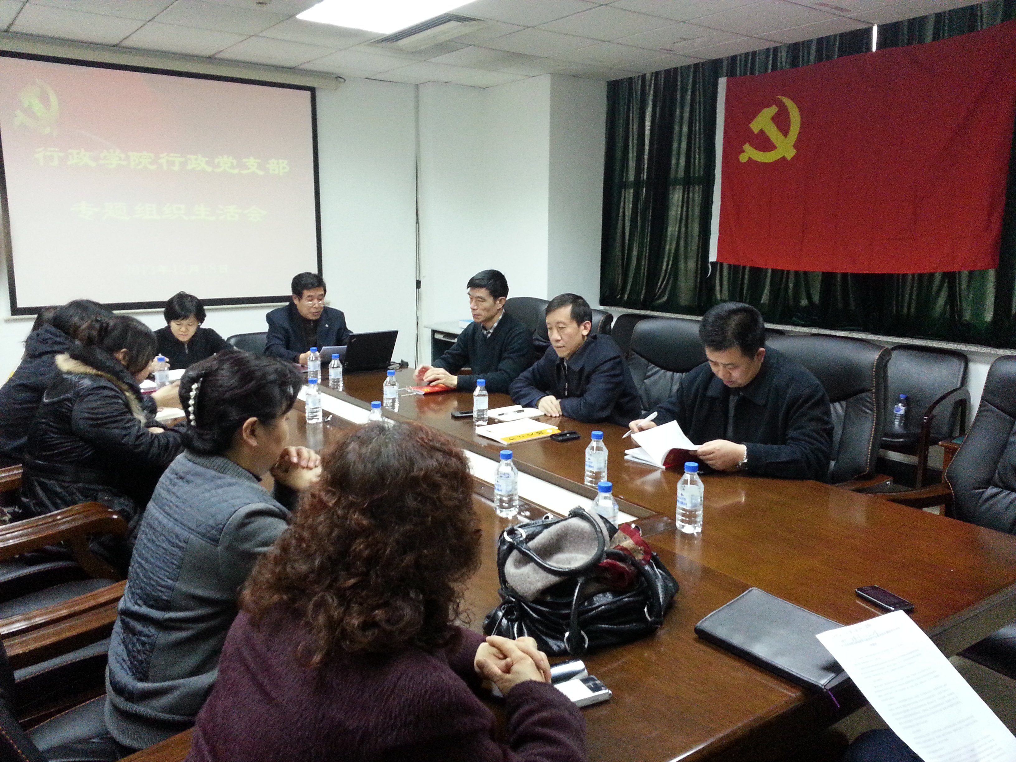 按照学校教育实践活动领导小组要求和《行政学院深入开展党的群众路线教育实践活动实施方案》安排,行政学院行政党支部于12月18日下午召开了专题组织生活会,学院行政党支部全体党员紧密结合思想和工作实际开展了深入的批评和自我批评。学院党委书记边铁、副书记常有余、副院长范斌和行政党支部全体党员参加了本次专题组织生活会,行政教辅队伍中党外人员列席了会议,会议由行政党支部书记扈广荣主持。