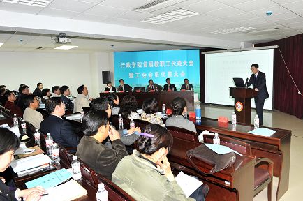 院长工作报告后,院工会主席李言做了题为《以“天下为公”为己任,共谱和谐发展新篇章》的工会工作报告。报告回顾与反思了院工会过去几年的工作情况,在充分肯定成绩的基础上,正确认识了学院工会工作的不足之处并提出了四点整改意见。报告还从加强自身建设、办好工会活动、完善民主制度、提高工作能力四个大方面重点阐释了院工会未来的工作思路与安排。会上,学院党委副书记许玉镇教授宣读了《行政学院教职工代表大会章程》(讨论稿)。