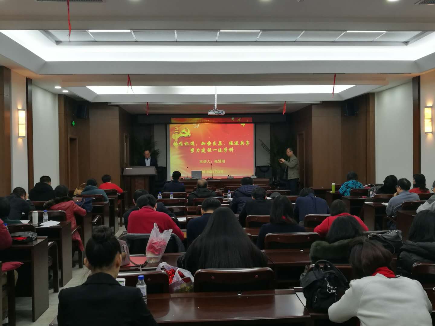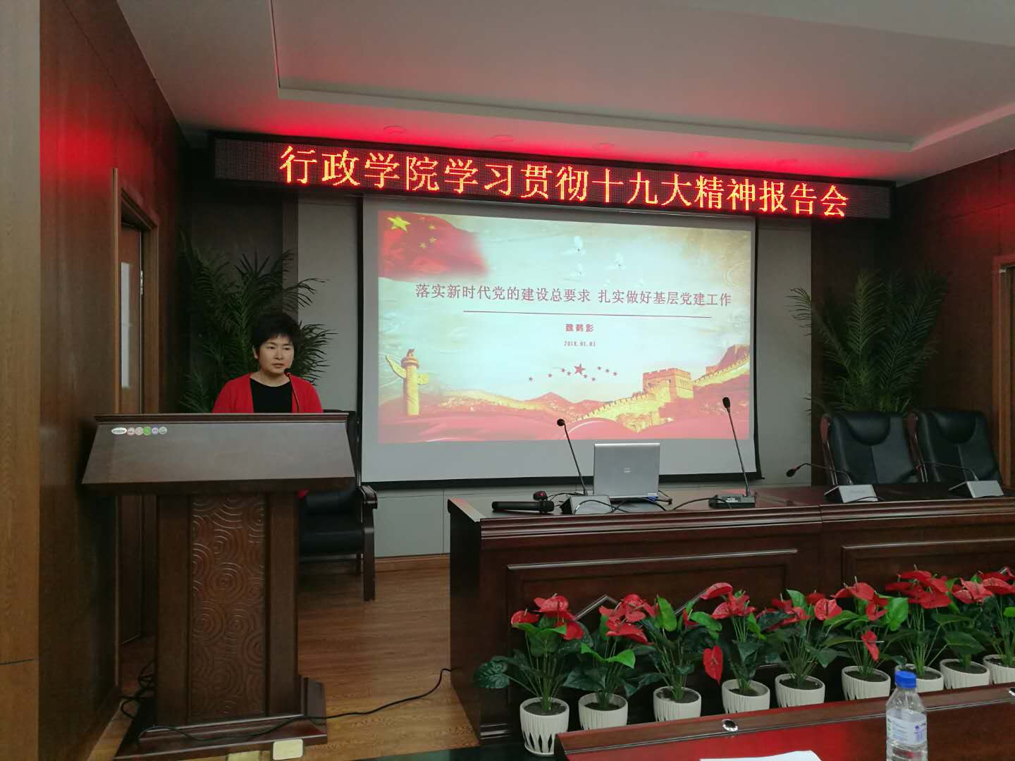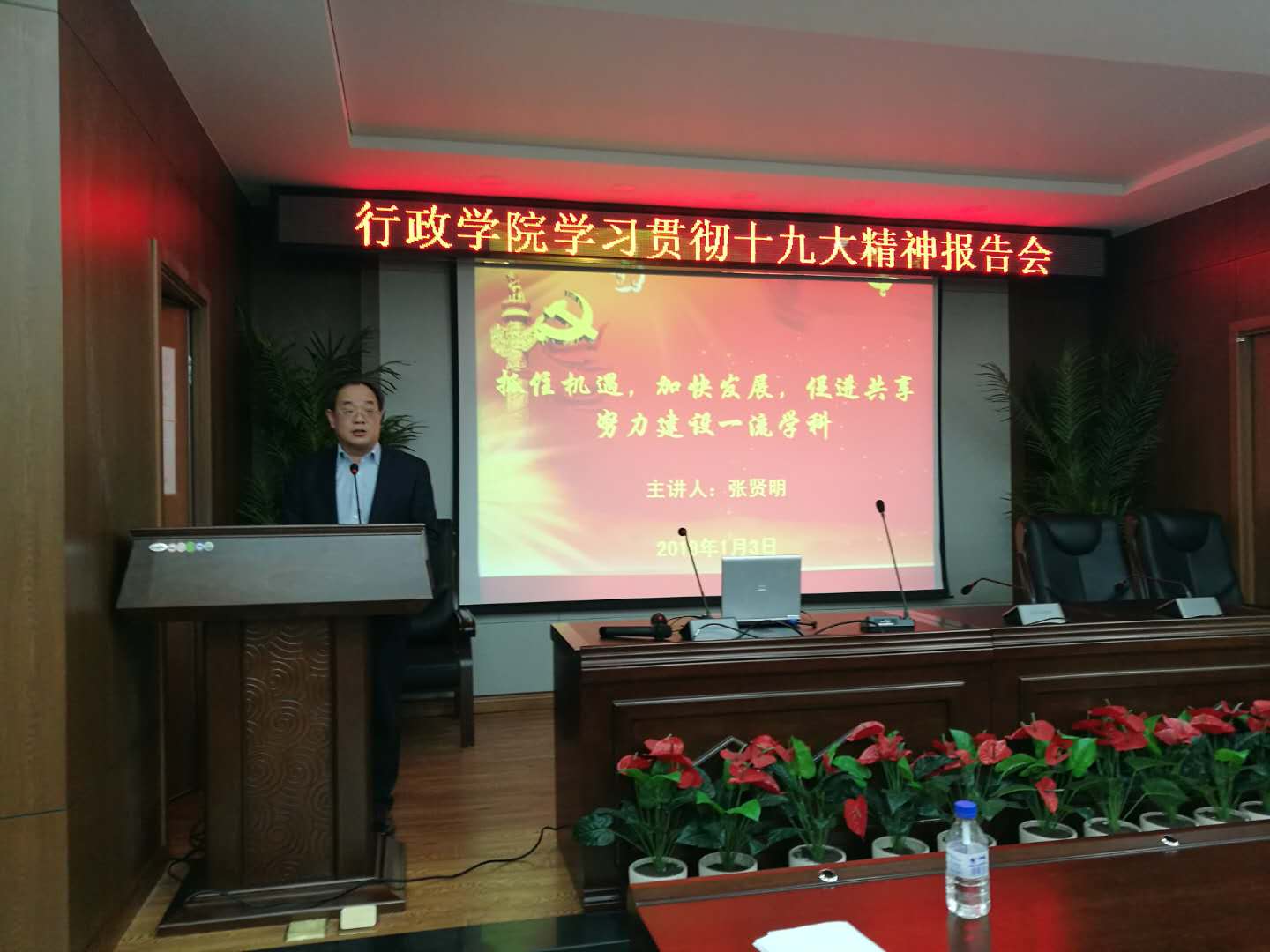 2018年1月3日下午,行政学院党委学习贯彻党的十九大精神专题报告会在东荣B303会议室举行,学院院长张贤明、党委书记魏鹤影分别讲授专题党课。全体教职员工参加了报告会,会议由学院党委副书记、纪委书记常有余主持。