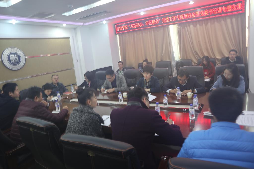 按照“不忘初心、牢记使命”主题教育工作安排,2019年10月16日,行政学院在东荣大厦1214会议室召开“不忘初心、牢记使命”党建工作专题调研会及党委书记讲授专题党课,学校第五指导组组长刘雪峰、联络员姜姗姗以及学院师生党支部书记和支部委员参加了会议。会议由党委书记魏鹤影主持。