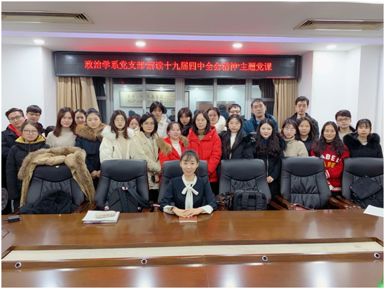 为深入贯彻学习党的十九届四中全会精神,12月17日晚,政治学系党支部于东荣大厦1214会议室举行了“解读十九届四中全会精神主题党课”系列学习活动,由吉林大学行政学院副教授、博士生导师、政治学系党支部书记刘畅解读十九届四中全会精神。来自政治学专业的研究生党员、积极分子参加了本次党课学习。