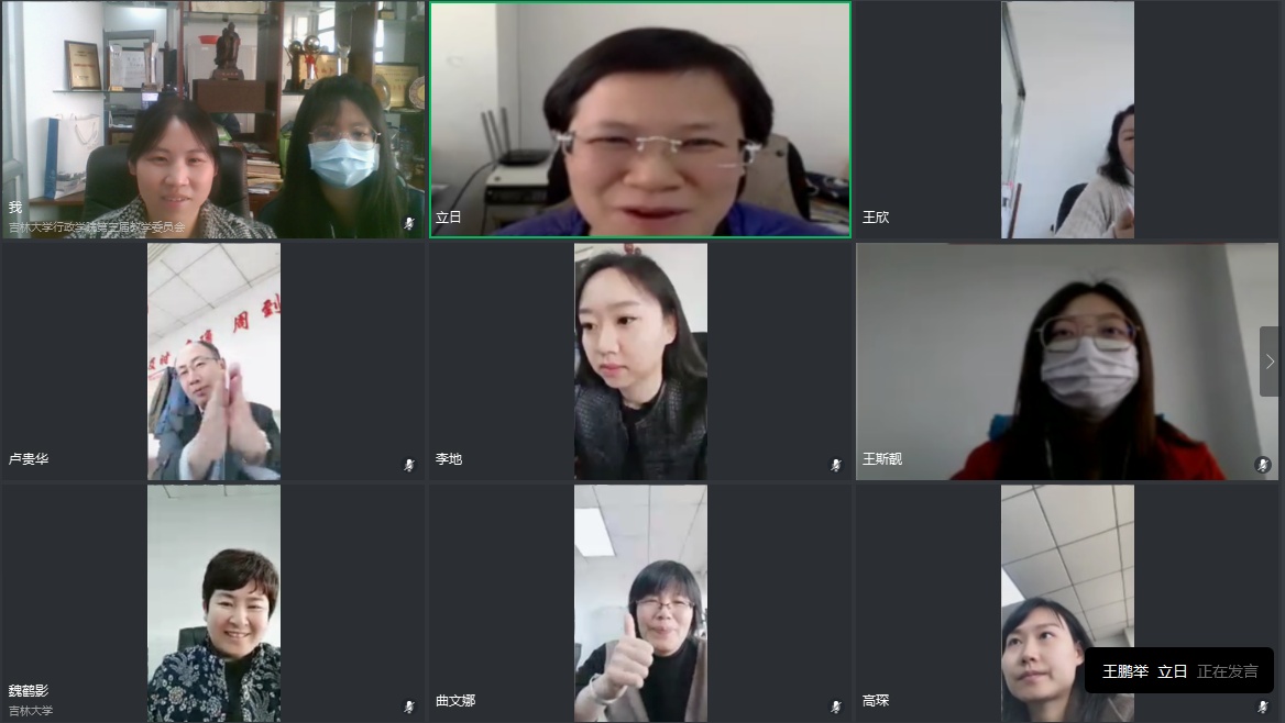 为深入贯彻党中央、国务院关于疫情防控系列重要部署,落实上级部门关于加强党的领导、为打赢疫情防控阻击战提供坚强政治保证的相关通知要求,机关教工党支部于4月1日下午组织开展“学习战‘疫’英雄,传递榜样力量”专题党日活动。在行政学院党委和吉大一院党委的大力支持下,支部特别邀请到了吉林大学第一医院援鄂医疗队队员张鹏、王鹏举以及吉林大学第一医院党委办公室于姗姗副主任到会讲授主题党课。行政学院党委书记魏鹤影、党委副书记兼副院长史慕华、副院长范斌及机关教工支部全体党员和党外行政教辅人员参加了此次活动,活动由党支部书记密佳音主持。鉴于疫情防控要求,此次活动采取网上视频会议形式开展。