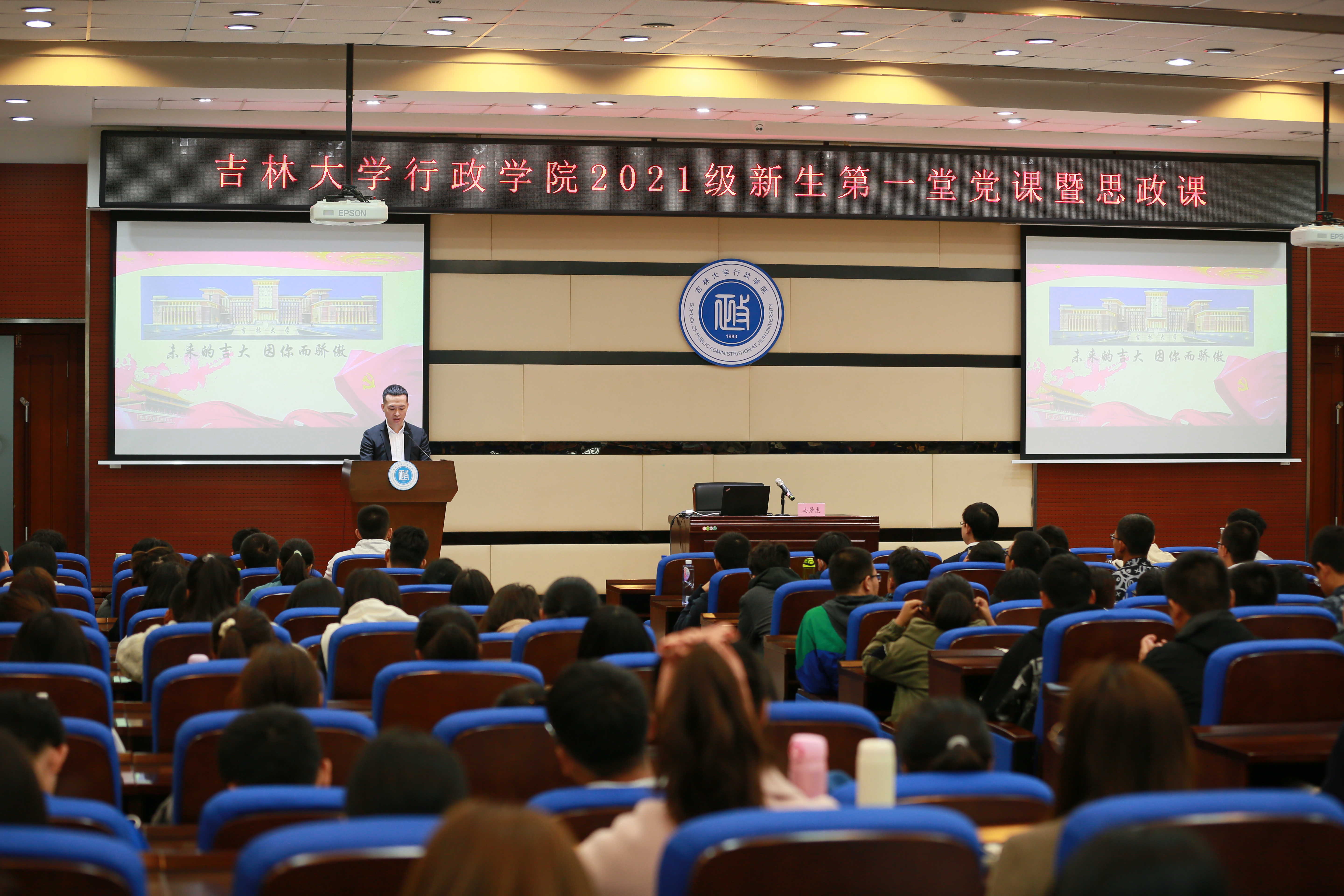 马景惠首先以时间脉络和重大事件为线,结合党史学习教育,向全体新生展示了一幅吉林大学在中国共产党领导下不断发展壮大的恢弘史诗,提纲挈领地回顾了吉林大学的建校合校历程,诠释吉林大学与中华民族同呼吸共命运、与共和国分忧难齐成长,突出强调了学校在不同历史阶段对新中国和社会主义建设做出的巨大成就。在马景惠带领下,同学们重温抗日战争和解放战争慷慨悲歌,致敬革命先烈舍生忘死、保家卫国;重温习近平总书记对黄大年同志先进事迹的重要指示,致敬时代楷模心有大我、至诚报国;重温援助一线医疗队逆行而上感人瞬间,致敬白医传人勇赴国难、大爱无疆。