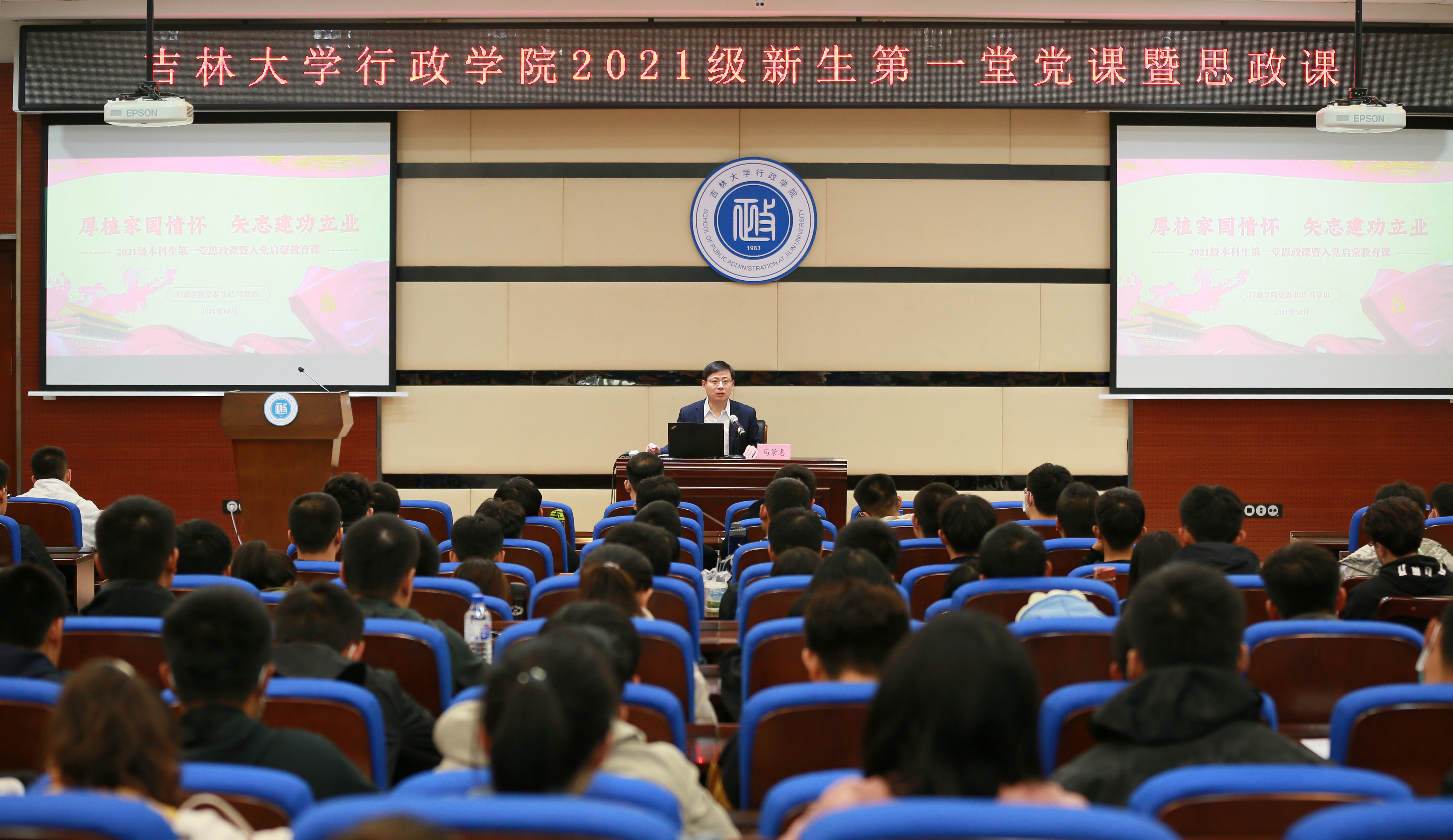10月13日上午,行政学院党委书记马景惠以“厚植家国情怀、矢志建功立业”为题,在东荣大厦B310报告厅为行政学院2021级全体本科生和研究生主讲党课暨思政课。