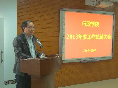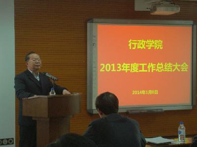 行政学院院长张贤明总结汇报了行政学院2013年度的学术和行政工作。他从人才队伍结构逐渐优化、整体水平呈现上升趋势;科学研究质量稳步提升、学术影响不断扩大;人才培养模式改革不断深化,成效显著;MPA教育不断规范,社会效益和经济效益均明显提升;学科平台建设扎实推进,成绩斐然;学术交流持续活跃,学术氛围日益浓厚;公务员培训工作努力进取,保持了良好势头;管理制度化建设不断加强、制度执行力不断提高;院庆工作充分展示学院发展的成就与影响,广获好评等九个方面汇报了一年来的工作和取得的成绩。他还在分析了行政学院面临的新形势的基础上,提出了学院未来的发展战略,即把握政治学和公共管理的学科发展趋势,结合国家和地方政治经济社会发展的实际需求,不断增强质量意识、创新意识和开放意识,坚定不移地走高水平、内涵式发展道路。围绕这一发展战略,具体从高水平的师资队伍、高水平的学科平台、高水平的学术研究、高水平的人才培养和高水平的服务管理五个方面阐述了2014年的工作思路。