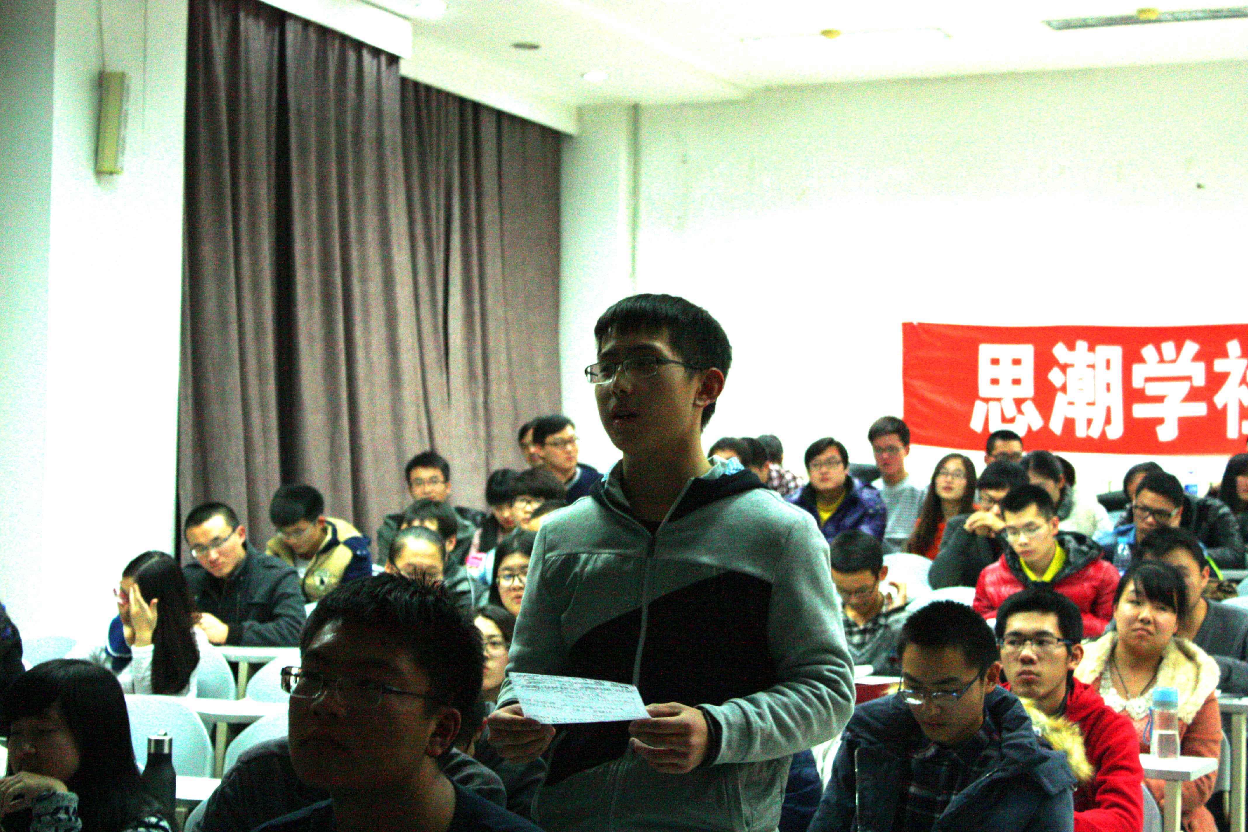 讲座过程中,于海洋从怎么读书和读书的意义两个方面给大家分享了自己的经验与感受,他结合当下社会背景、大学状况、学生状态给大家提出了关于读书方法的建议,他认为在这个微阅读盛行的时代大家应该多进行深阅读,应该通过反思和批判来提高自己,拒绝被愚弄,做一个智慧的人。在读书意义方面,于海洋结合国际政治相关案例和自己的经历谈了读书的意义。他认为读书能让你丰富基础知识、提高判断和拣选能力,在批判中建立自己的知识体系、世界观甚至人生信仰,他期冀大家能在阅读中秉正道而行,能获得道德上的修炼提升。最后,于海洋还就碎片化阅读的利弊、电子书与纸质书的区别、读书应该追求意思还是意义等一些问题回答了现场听众的提问。于海洋对于读书的深刻认识和精彩讲解,幽默风趣而又发人深省,赢得了现场观众阵阵热烈的掌声。讲座结束后,思潮学社向参与本次讲座的前50名同学赠送了精美图书。