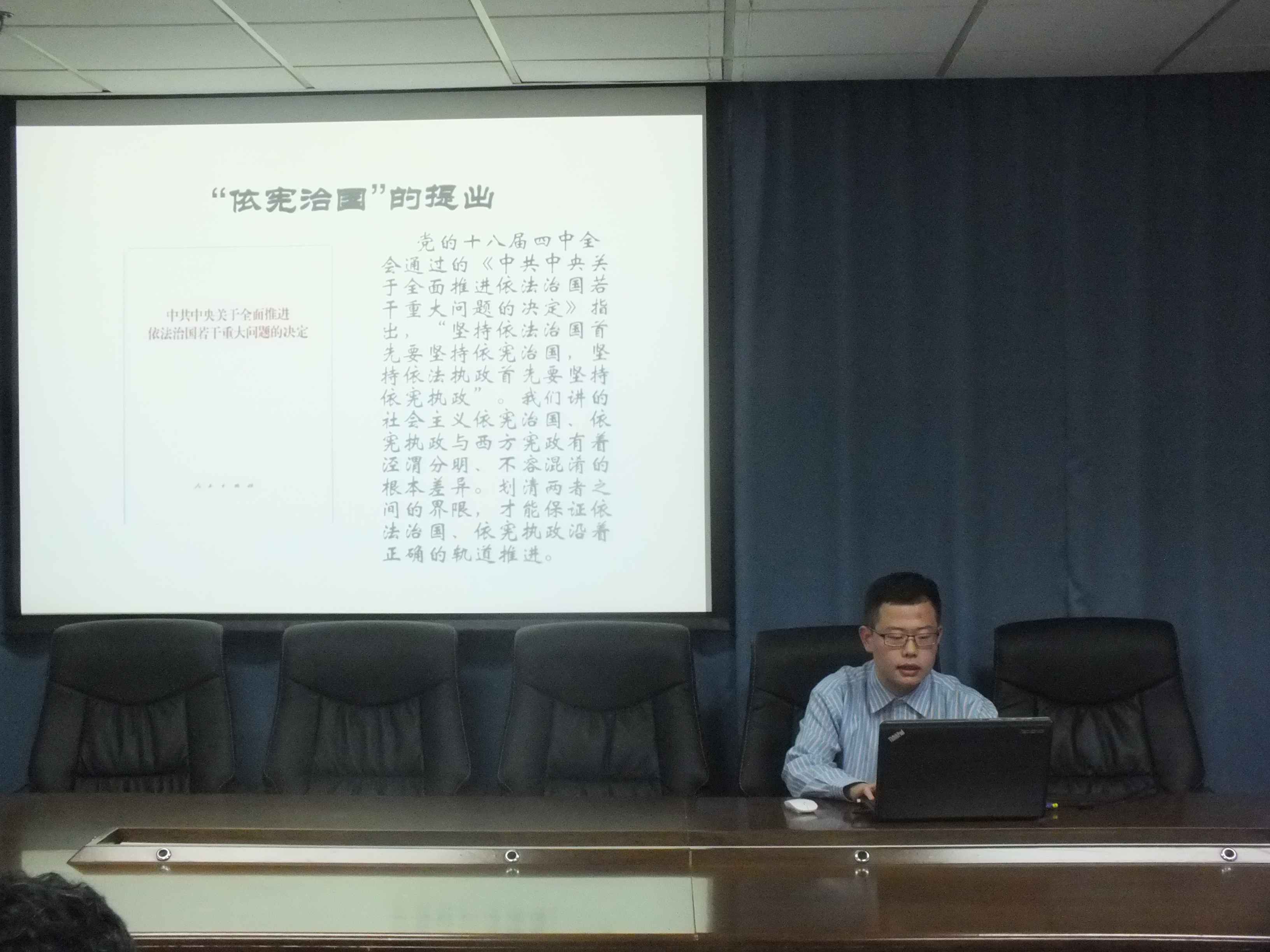 为全面贯彻落实党的十八届四中全会精神,11月28日晚6时,行政学院思潮学社在吉林大学前卫南区东荣大厦511会议室举办了十八届四中全会精神研习讨论会。校社联相关负责同学、行政学院社团部部长苏靖(2012级)、院属各社团社长和行政学院部分本科生参加了此次讨论会。讨论会由杨端程(2012级)担任主讲人。