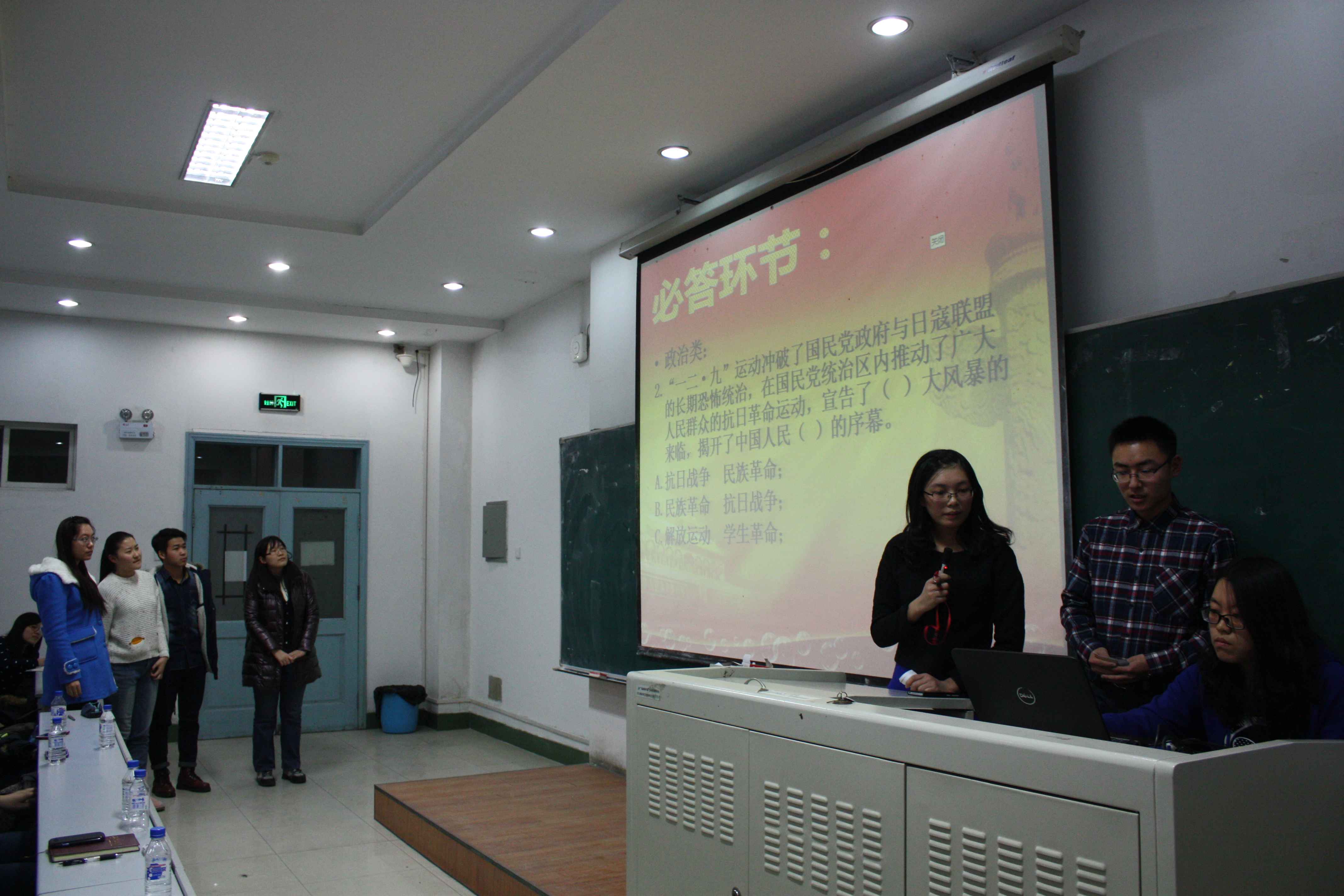 为铭记光荣历史,争做优秀团员。行政学院纪念“12.9运动”团日活动第二场——“12.9”主题知识竞赛于12月7日晚6点在吉林大学前卫南校区三教三阶进行。本科生辅导员刘洋、曲畅竹,团委主要学生干部出席本次活动。本次活动由姜鹤(2013级)和王森(2014级)主持,参赛的五个队伍分别是2014级四个班级和社团代表队。