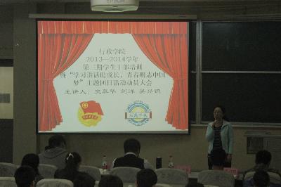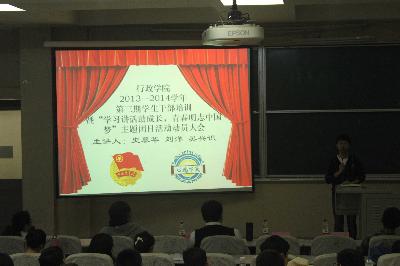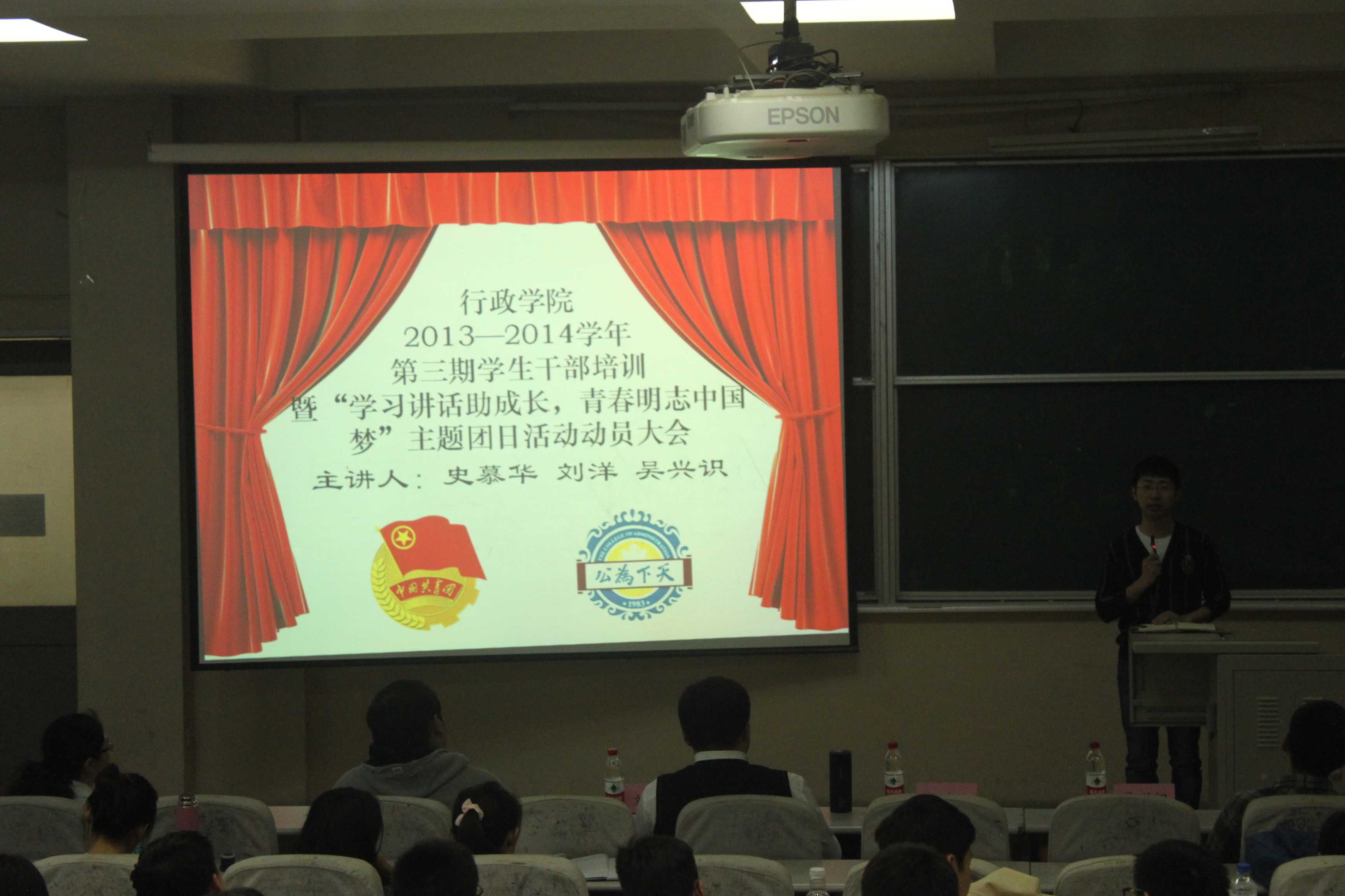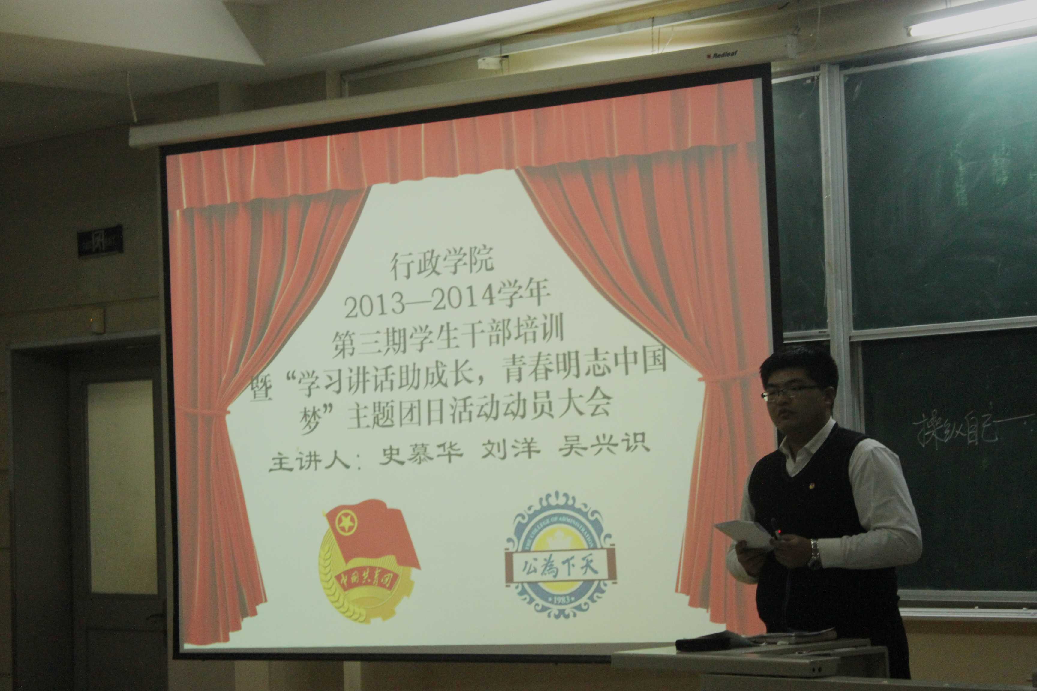 大会在庄严的校歌声中拉开帷幕。会上,史慕华老师在动员讲话中指出,学生干部具有学生和干部的双重身份,但首先要以学生为主,以学业为重。与此同时,在服务同学的过程中,将收获的经验内化为在今后工作中需要的技能,为以后更好地学习生活奠定坚实基础。其次,学生干部在工作和生活中,要懂得取舍,学会合理安排时间与平衡学生和干部两种身份间的关系,实现学业和工作上的双丰收。最后,史慕华老师希望同学们能积极参与到“学习讲话助成长,青春明志中国梦”的主题团日活动中来,在行政学院这个大集体中不断成长,并预祝团日活动取得圆满成功。吴兴识则对大家进行了“了解思考的魅力”学生干部培训,他从“反思自己”、“了解自己”、“培养自己”及“操纵自己”这四个方面详细阐述了思考对于学生干部培养的重要意义。他指出,各位学生干部要充分了解自己,在保持自己优势的前提下,弥补自身的不足,提升自己的感受力、领悟力和表现力,展现出更完美的自我。刘洋老师结合学院领导对“学习讲话助成长,青春明志中国梦”主题团日活动的动员指出,加强学习习近平总书记系列讲话精神有利于大家进一步了解党和国家在现阶段的路线、方针、政策,有利于提高大家掌握判断形势明辨是非的能力,有利于加深大家对专业知识的了解,有利于大家提高自身应用公文写作水平。他还组织大家学习了习近平总书记系列讲话精神,并结合自己对习近平总书记讲话文本的学习体会对上述四方面做出了细致举例。随后,他又结合自身经验就公文写作和幻灯片制作对在场的同学干部进行了系统的培训。院团委副书记赵吉(2011级)和团委组织部部长李媛媛(2011级)为同学们介绍了团日活动的具体安排和开展的注意事项。最后,大会在雄壮的团歌声中落下帷幕。