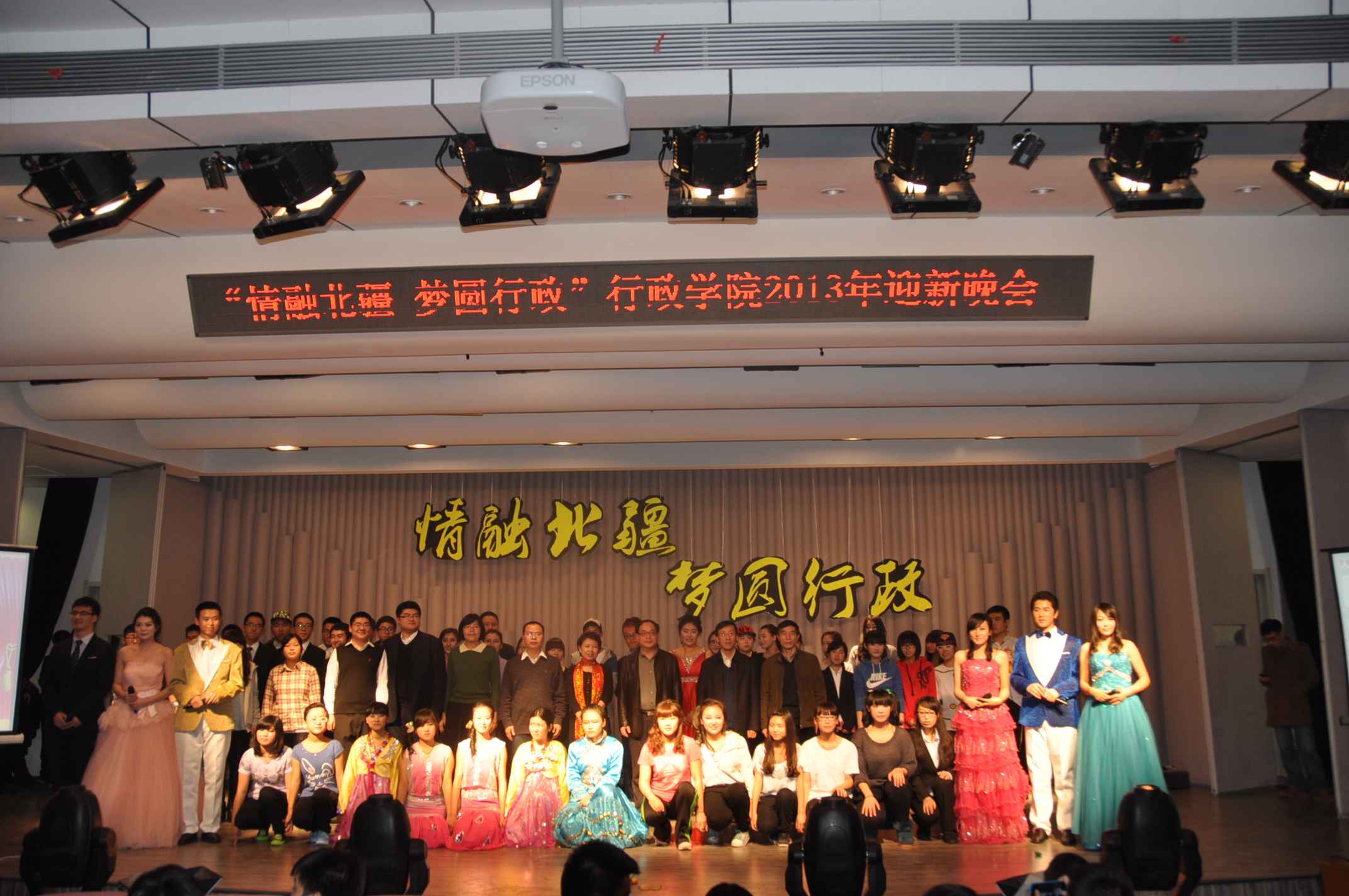 11月29日18时,“情融北疆·梦圆行政”—— 行政学院2013年迎新晚会于吉林大学中心校区音乐厅隆重举行。行政学院院长张贤明、党委书记边铁、党委副书记常有余、副院长许玉镇、副院长殷冬水和党委副书记兼副院长史慕华等学院领导与教职工代表出席了本次晚会。学院全体本科生和研究生新同学、老同学代表,部分兄弟学院学生代表、多家校内媒体记者一起观看了晚会。本次迎新晚会由学院研究生工作办公室和学生工作办公室联合承办,晚会由经选拔产生的研究生和本科生同学代表共同主持。