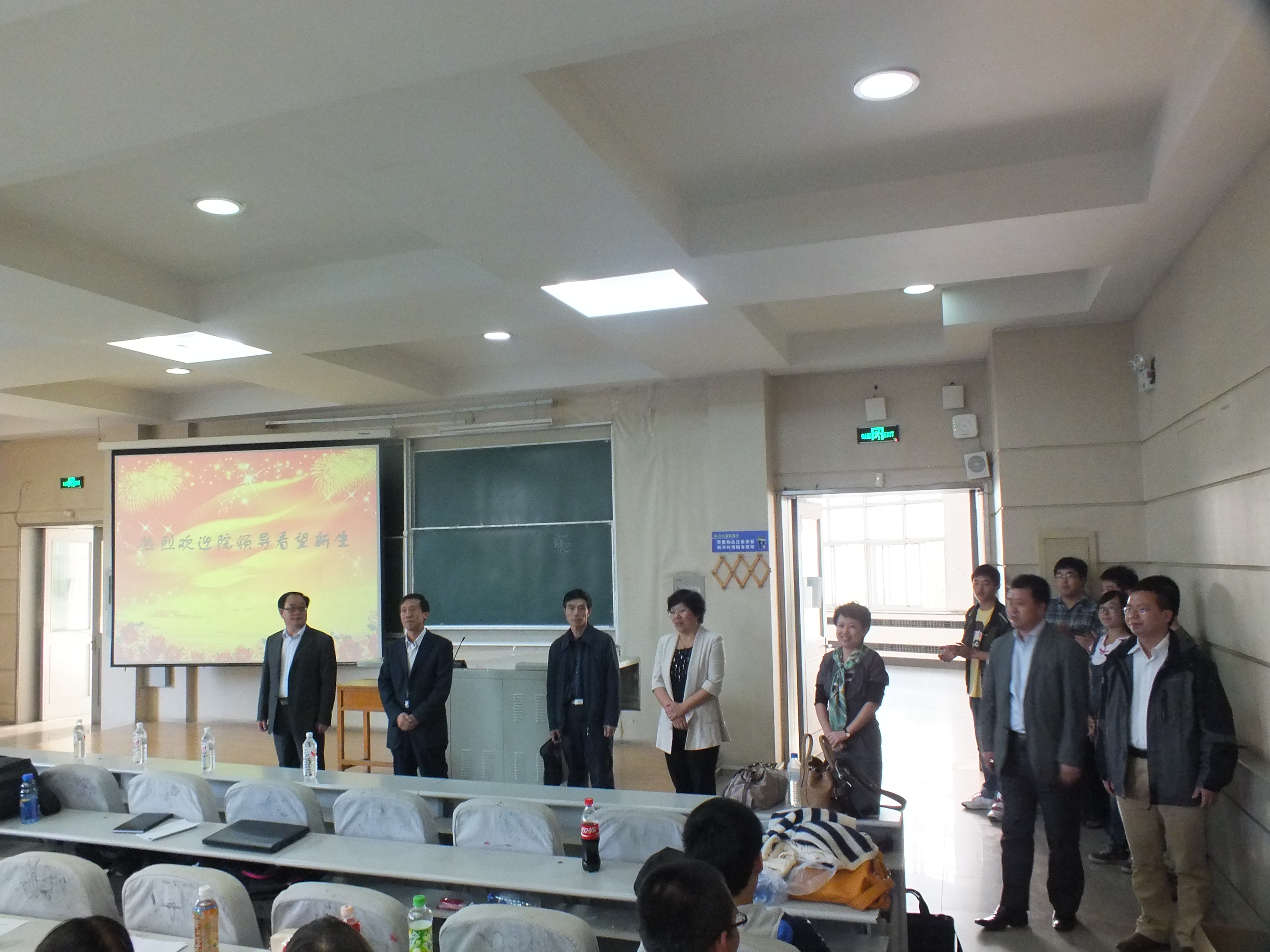 9月12日下午四时,行政学院党委书记边铁,院长张贤明,党委副书记常有余,副院长刘雪莲、许玉镇、殷冬水、范斌等学院领导在本科生辅导员刘洋和助理辅导员吴兴识的陪同下来到逸夫教学楼第三阶梯教室看望刚刚参加过入学典礼的全体2013级新生。