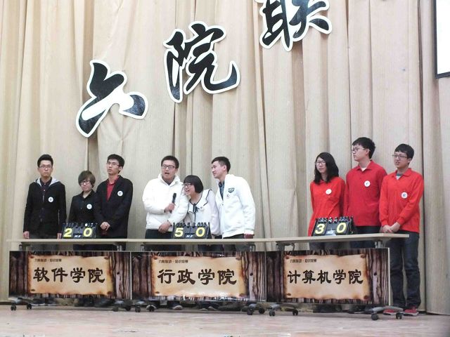 4月8日晚6时许,由文学院主办,行政学院、法学院、商学院、计算机科技与技术学院、软件学院协办的“爱国、荣校、知礼”六院联动知识竞赛在中心校区经信报告厅隆重举行。校团委副书记叶鑫、文学院党委副书记兼副院长刘卓、法学院党委副书记兼副院长赵洁以及各参与学院团委负责人应邀出席观看比赛并担任评委嘉宾。