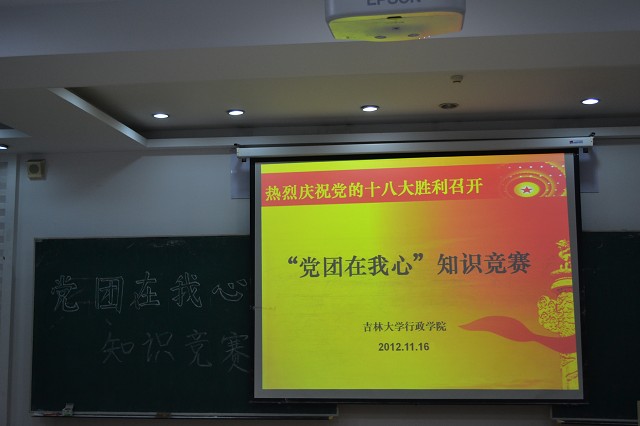 高举旗帜,行政学子跟党走;凝聚力量,师生同心创佳绩。为庆祝中国共产党第十八次全国代表大会胜利召开、迎接吉林大学政治学学科创建三十周年暨行政学院建院二十周年,11月16日19时,行政学院团委组织部和学生会宣传部、外联部联合主办的“喜迎十八大 共创新佳绩”系列活动之行政学院“党团在我心”知识竞赛活动于中心校区经济信息教学楼第六阶梯教室成功举行。行政学院助理辅导员刘洋,行政学院团委、学生会及大学生通讯社主要学生干部出席本次活动。