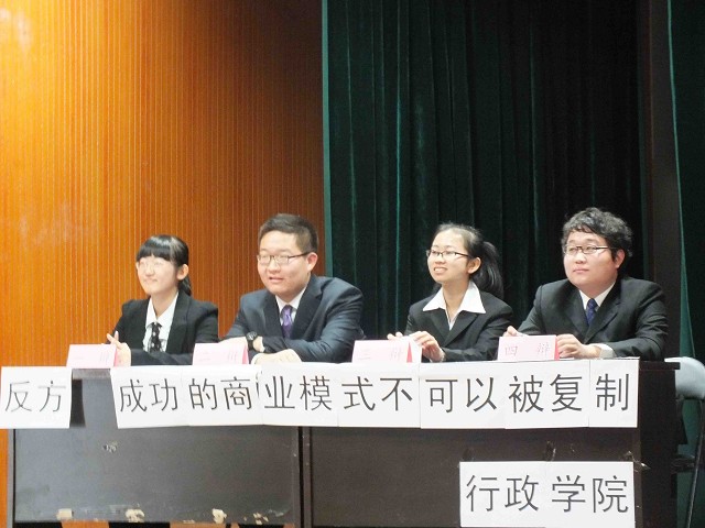 巧言擅辩,借古今智慧昂扬睿智;风起云涌,享乾坤寥廓挥斥方遒。比赛开始前,行政学院代表队再现狄仁杰审案的场景,运用当下流行的“元芳体”进行了创意新颖独特的自我介绍,赢得了现场观众的一致好评。开篇立论阶段,作为正方的数学学院从复制商业模式可以为企业发展提供经验、避免走弯路的角度全面阐释了借鉴成功的商业模式对于一个企业发展的重要性,具体论证了“成功的商业模式可以被复制”的命题。反方行政学院范子雁则结合柯达、诺基亚等著名企业的案例从理论与现实的两个角度论证了一味复制他人的商业模式而不知创新,对一个企业发展的破坏性影响,进而对“成功的商业模式不可以被复制”的观点进行了精确的阐述。攻辩与自由辩论阶段,辩手们反应灵敏、妙语连珠,充分展示了他们丰富的学识和敏捷的思维,双方智慧的较量与语言的交锋使现场高潮迭起,赢得了评委及在场观众的阵阵掌声。总结陈词阶段,行政学院张冰条理清晰,旁征博引,严密论证了本方观点。最后,本场比赛评委、吉林大学管理学院杨修博士对比赛进行了点评。他对本次辩题给予了深刻的剖析,并充分肯定了双方的精彩表现,同时,他也客观指出了双方在辩论技巧等方面的不足并提出了自己的意见。经过评议,行政学院代表队最终惜败于数学学院,遗憾止步十六强。