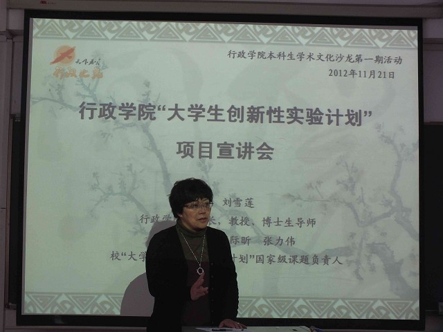11月21日14时,由行政学院“学术文化沙龙”秘书处主办的行政学院本科生“学术文化沙龙”第一期活动之吉林大学“大学生创新创业训练计划”项目宣讲会在中心校区第三教学楼305教室成功举办,行政学院副院长、博士生导师刘雪莲教授应邀出席宣讲会并担任主讲嘉宾。