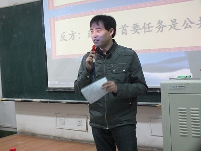10月12日晚6时,“行政论坛”辩论赛决赛在中心校区第三教学楼三阶隆重举行。行政学院国际政治系许宁老师,政治学系朱万润老师,助理辅导员刘洋,行政学院博士研究生杨博、曲恩道,硕士研究生田玉麒、李晓霞,哲学社会学院辩论队领队董键铭,商学院辩论队领队曹雨情,白求恩医学院辩论队领队潘宣齐等嘉宾应邀出席本次比赛并担任评委。参加本次活动的还有“行政论坛”教练组成员、行政学院主要学生干部及2012级全体学生。本次辩论赛由学生会秘书处副部长李妍担任主席。