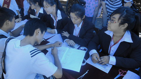 学院迎新点设在五月花广场。在这里,各学院搭起帐篷,竖起标牌,等待新生的到来。我院工作人员身着正装,显得严肃认真且精神抖擞。他们将引导新生填写各类信息,并为陪同家长提供细致入微的服务。细心观察,我们可以看到,一些新生因为紧张或是兴奋,而在填写信息的时候遇到各种阻碍,但热心负责的师姐们会第一时间帮助他们解决问题,她们温馨的笑容也舒缓了新生扣紧的心弦。迎新点的工作量是巨大的,在一天的忙碌后,工作人员的脸上往往会流露出一丝倦意。