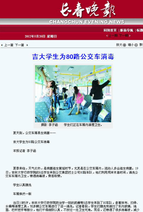 5月19日,我院2011级政治学一班的“公行”志愿者们在长春巴士公交公司80车队进行了以“服务公交,爱在长春”的志愿服务活动。此次活动得到了公交巴士公司员工们的肯定和长春市民的赞赏,同时也受到了《长春晚报》的报道。
