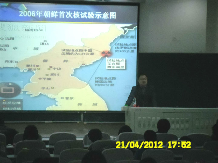 在报告会中,郭锐老师从朝核问题不断反复的远因近由及其产生的地区安全影响、中国在朝核问题上的战略与对策和朝核六方会谈存在的的问题与取得的成果四个方面对朝核问题进行了全面深入的分析。他首先阐述了整个东亚安全格局现状,并由此引出了朝鲜核问题的“前世今生”。结合历史上国际社会对利比亚、伊朗、印巴等国家核问题的解决方式,郭老师对当今朝鲜所处的国际环境进行了剖析,他指出“在现在的国际环境下,朝鲜要么一意孤行,选择和伊拉克、利比亚一样的‘死法’;要么转变政策,选择具有朝鲜特色的‘活法’”。随后,郭锐老师又站在中国的视角,从地缘政治、国际关系、战略意义等方面为同学们分析了中国对待朝核问题的策略。他表示,“中国应充分地认识到朝鲜在中国实现和平崛起中的重要战略遗产价值和地缘战略价值;应更积极地实施中立化、无核化的朝鲜半岛政策”。