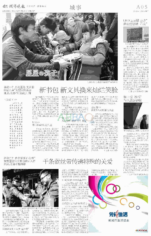 4月2日,星光志愿服务队同学早早来到长春市红旗街百脑汇门前的“放飞梦想”活动现场,悬挂蓝色宣传条幅、发放自闭症日宣传单、散发蓝色气球,快乐地忙碌着。自闭症儿童及其家长们来到活动现场,其家长代表表达了对我院志愿者一直以来对自闭症儿童的志愿服务的感激之情,名叫渺渺的自闭症男孩演唱《北京欢迎你》表达对志愿者的感谢,我院志愿者也为孩子们送上精心准备的学习用品。