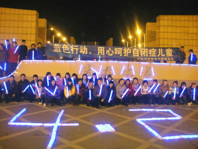 4月2日是国际自闭症日,为呼吁社会各界关注自闭症群体及其家庭,吉林大学行政学院星光志愿服务队和长春市星光特殊儿童训练养护中心在吉林大学和长春市百脑汇举办了关爱自闭患儿 的"点亮蓝灯"和"放飞梦想"的"蓝色行动"系列活动。4月1日晚18:30,我院星光志愿服务队和星光养护中心的老师们在吉林大学东门举行了“点亮蓝灯”活动,我院团委副书记马远俊参加了此次活动。湛蓝色天幕下,同学们手持蓝色荧光灯用爱和真心与老师们合力摆出“心”、“4、2”等图案,呼吁社会关爱自闭症儿童,关注自闭症群体。