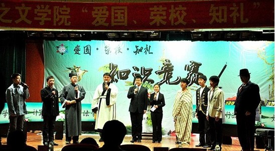 知识竞赛分为“针锋60秒”、“一唱三和”、“智慧交叉”、“我爱记歌词”、“劳逸结合”、主题演讲六个环节,中间穿插各院独具特色的风采展示。比赛在软件学院“极夜乐队”的原创歌曲中拉开帷幕。在“针锋60秒”环节中,需要选手在一分钟内答出十道题,我院选手接连答对九道,充分体现了深厚的专业功底。第一环节结束,文学院献上古筝、二胡伴奏朗诵 《我的祖先名叫炎黄》。接下来是我院代表队的名人COSPLAY,用从古至今、中国与西方先贤的经典话语展示高尚的政治思想,体现了行政学院浓厚的人文底蕴和专业特色。在接下来的两个环节中,我院选手以良好的心理素质和深厚的知识积淀轻松赢得满分。在比赛的后两个环节中尽管我院比分暂时落后,但是我院参赛选手毫不气馁,奋起直追。在比赛最后的环节中,各队从10个主题中任选一个进行2分钟的主题演讲。我院代表队抽到“911 卡扎菲 美国”的主题,我院选手们利用专业优势侃侃而谈,博得了评委和观众的一致认可。六个环节结束后,经过现场评委们的认真评选,我院代表队获得了团体三等奖的好成绩,其中吕歆珂获得“最佳风采奖”的个人奖项。