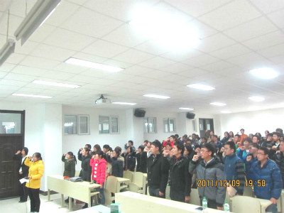 大会在庄严的国歌声中拉开序幕。首先,同学们观看了“一二•九运动”的主题纪录片,以此回顾那段峥嵘岁月。接下来,同学们通过配乐诗朗诵、红色电影配音等形式的精彩表演以及猜红歌歌名、我爱记红歌歌词等以红色经典为主题的知识竞赛表达了对一二•九运动的纪念和对革命先烈的缅怀。随后,团委副书记马远俊进行了总结性发言,他结合“一二•九运动”历史和当今大学生现状阐述了爱国主义、集体主义对于当代大学生培养正确的人世界观、人生观、价值观的重要意义。他的发言使在场的同学深受鼓舞,更加深刻地认识到自己应承担的历史责任与使命。在此之后,团委副书记马远俊和09级党支部负责人吴满为在竞赛环节中表现出色的11级1班和10级2班颁奖。活动的最后,在吴满的倡议下全体人员进行了宣誓仪式。在激昂的宣誓声中,大会圆满结束。