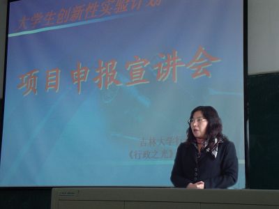 2011年4月1日,由吉林大学行政学院《行政之光》杂志社主办的“大学生创新实验计划”项目申报宣讲会在三教十四阶顺利举行,行政学院副院长刘雪莲教授、辅导员马景惠老师以及对项目申报有着丰富经验的同学参加了本次宣讲会。