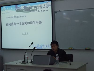 10月28日晚六点,行政学院2010年度第一场学生骨干培训大会在逸夫教学楼MPA教室举行。行政学院团委书记兼辅导员马景惠老师、软件学院团委书记薛雷老师、软件学院辅导员潘璐老师以及行政学院团委、学生会以及10级班委的全体成员出席本次培训。团委高天健和李天伶主持了本次培训。