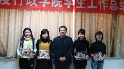 接下来是轻松的颁奖环节,出席会议的嘉宾老师分别颁发了评奖评优中的获奖学生代表奖、09年学生活动优秀社团奖和09年学生活动优秀个人奖。一份份并不贵重的奖品蕴涵的是整个行政学院对在各方面表现优异的团体和个人的肯定和鼓励,并希望获奖同学能够以此为新的起点,在将来取得更好的成绩。