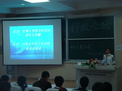 在前不久举行的“行政论坛”海选中,十六位选手脱颖而出,组成了四支辩论队,经过一周的系统训练和精心准备,辩手们的技巧和水平都有了很大程度的提高。他们凭借自己优秀的表现为在场观众献上了两场精彩的辩论赛。
