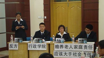 2008年10月26日18:00,“先锋论坛”于理化楼第三教室举行。本次辩论赛围绕“赡养老人社会责任与家庭责任哪个更重要的问题展开。作为反方,行政学院以“赡养老人家庭责任大于责任”的立场观点与化学学院对阵第二轮比赛。