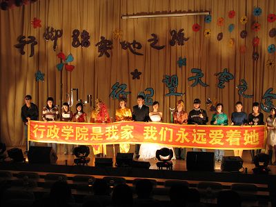 晚会在热烈动感的开场舞中拉开帷幕。晚会上同学们尽情表演,展现着行政院人的青春风采。悠扬动听的独唱和连唱,风格各异的舞蹈,风趣幽默的相声,还有乐器演奏、武术表演、同学们自创的舞台剧等等,一个个精彩的节目将晚会气氛不断推向高潮。特别是在时装表演节目的最后,演员们缓缓的将写着“行政学院是我家,我们永远爱着她”的条幅展现在观众面前,引起了场下观众的强烈共鸣,谱写了行政学院大家庭的温馨 。最后,晚会在05级学生会同学们的一曲《相亲相爱一家人》中圆满落幕。