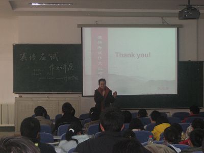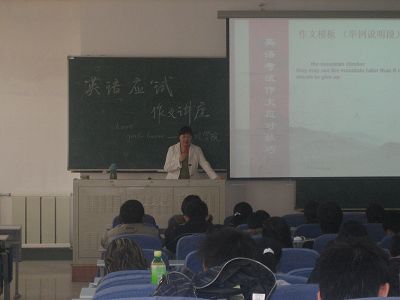 07年3月14日下午,我院邀请公共外语教学中心的优秀青年教师伍思静老师在三教二阶为大家做了一场英语应试作文讲座,这次讲座得到了院领导和老师的重视和支持,张锐昕副院长、佘彦副书记和马景惠老师都亲临现场和同学们一同认真学习,会后张锐昕副院长从英语学习角度为大家做了重要讲话。