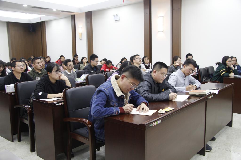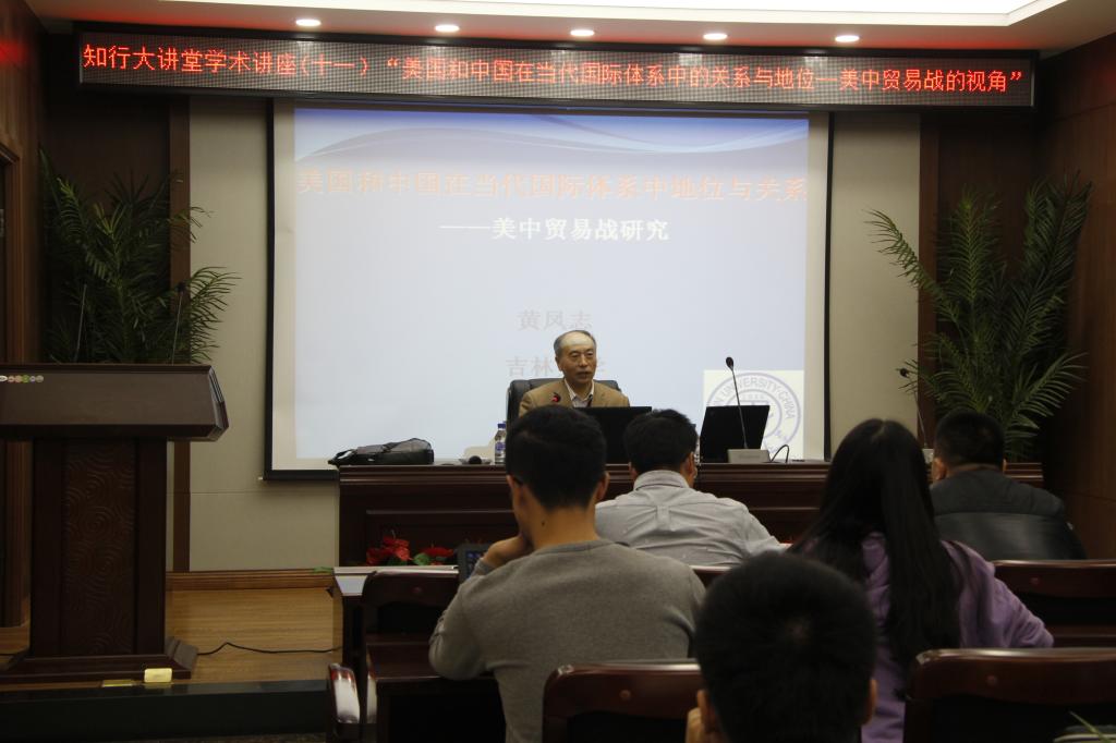 10月25日晚,行政学院《行政之光》杂志社于东荣大厦举办了第十一期“知行大讲堂”系列学术讲座。本期讲座邀请到了我院国际政治学系黄凤志教授作为主讲嘉宾,主题为“美国和中国在当代国际体系中的关系与地位——美中贸易战的视角”。院学工办主任、本科生辅导员刘洋和本科生、研究生七十余人参加了本期讲座。本期讲座由薛涛同学(2017级本科生)主持。