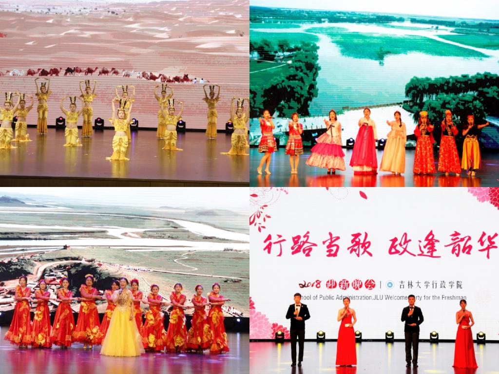 乐起舞动,激情四射的舞蹈《Latata》拉开了晚会的序幕。《Who Dat Boy》、《DDu-Du DDu-Du》等舞蹈热烈而奔放,点燃了全场观众的热情;说说军训那点事儿,话剧《花木兰》讲述了军训中表现懒散的主人公在穿越后见证花木兰的英勇事迹而深受触动的故事;小品《四大才子》演绎了一场令人啼笑皆非的比武招亲,台下观众笑声不断;感谢在祖国的北疆遇到最好的你们,《陪我长大》与《最美的期待》唱出了这份相遇的小幸运;婉转抒情的歌伴舞《礼仪之邦》将舞蹈和声乐融合,传递出中华文化的无穷魅力;信仰指路,未来可期,诗朗诵《写给未来的你》激励行政学子昂首阔步向前进;朝鲜族、苗族、维吾尔族等少数民族同学带来的歌舞串烧展现出他们源于生活又充满诗情的民族之美,一曲《美丽中国》抒写了全民族共同的爱国之情。硕士研究生也带来了精彩的歌舞表演:一首民谣——《阿刁》,让我们触到一个纯净而诚恳、从容而倔强的灵魂;舞蹈《丝路》的表演者们的曼妙身姿勾勒出大漠的神秘,悠悠驼铃犹在耳边。2018级本科生的班主任们也登上了舞台,歌颂那于白山黑水间尽显荣光的校园。一首《吉大赋》,72年的变革画卷尽铺陈;一首《吉大赋》,光明的未来之路正迈进。此外,团委书记曲畅竹与我院学生会主要负责同学也合唱了歌曲《你曾是少年》和《光阴的故事》,献给数周以来为本次晚会辛苦排练的演员及默默付出的工作人员。2018年迎新晚会在《亲吻祖国》的嘹亮歌声中落下帷幕。