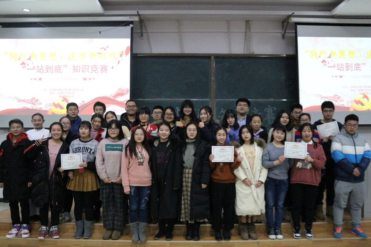 为弘扬“一二·九”爱国运动精神,丰富学生文化生活,引导我院广大学生学习习近平新时代中国特色社会主义思想。12月12日18时,由共青团吉林大学行政学院委员会主办、吉林大学思潮学社与行政学院 081705 班团支部承办的以“践行新思想,建功新时代”为主题的“一站到底” 知识竞赛活动在经信教学楼F9阶梯教室准时进行。我院2018级本科生各班代表及青年学习班代表组成6支队伍、共30名选手参加了本次竞赛。院学工办主任刘洋及院团委书记曲畅竹作为嘉宾出席了此次活动。