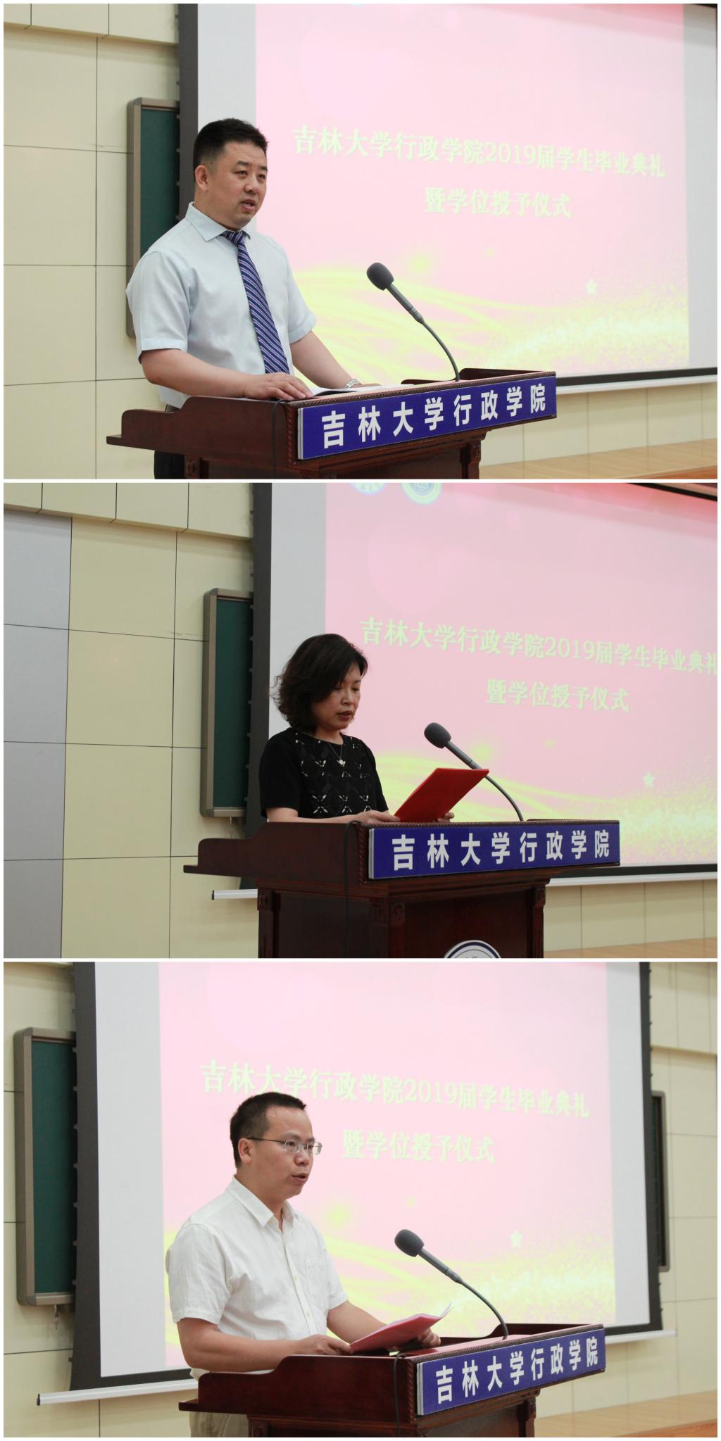 6月24日上午,吉林大学行政学院在中心校区数学楼报告厅隆重举行2019届学生毕业典礼暨学位授予仪式。参加本次典礼的有:吉林大学社会公正与政府治理研究中心主任、博士生导师周光辉教授,吉林大学匡亚明特聘教授、博士生导师王彩波教授,行政学院院长、博士生导师张贤明教授,行政学院党委书记魏鹤影研究员、党委副书记常有余老师、副院长许玉镇教授、副院长殷冬水教授、副院长于海洋教授、廉政研究与教育中心行政副主任密佳音老师等学院领导、学院教师代表等。毕业典礼由学院副院长范斌老师主持。