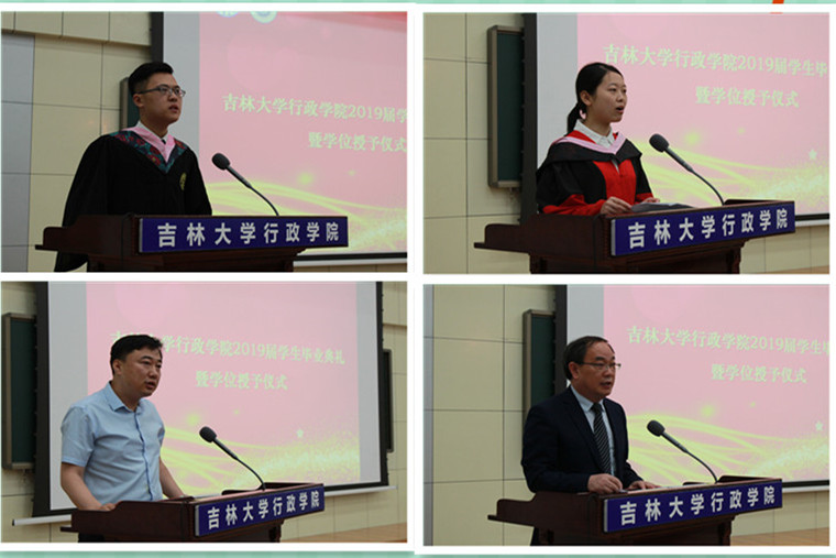 本科毕业生代表周金霖同学上台发言。他带着对于往昔的追忆进行大学生涯的回顾,娓娓道来自己的心路历程,他带着对于父母、老师、同学的感恩,憧憬美好的未来;研究生毕业生代表崔珊珊同学在发言中对多年来老师的职业指导与思维方式等多方面的教导,致以敬意和感谢。同时她希望通过最初的向往与目标来明确一种自我定位,通过自由意志、独立精神追寻实践的意义。她也祝福每个人不负吉大、不负期待。