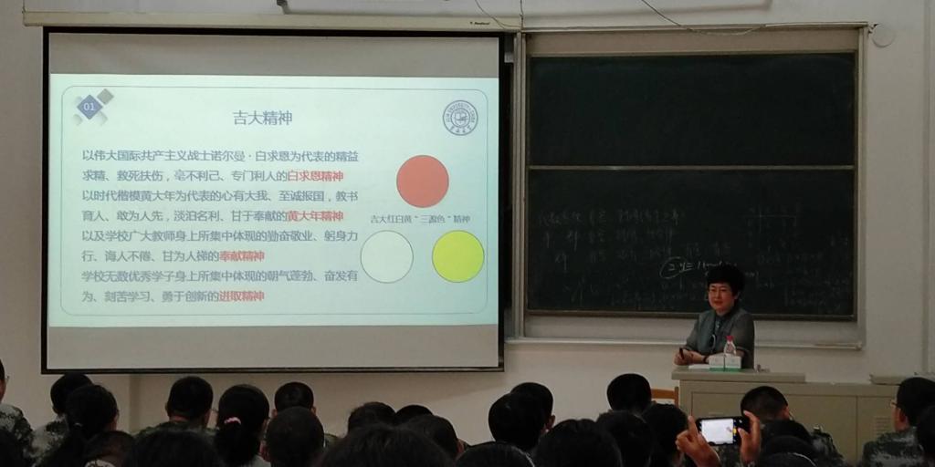 在思政课上,魏鹤影就学校和学院的基本情况向同学们作了全面的介绍。她从办学定位、综合排名、发展历史、学科门类、师资力量和人才培养等多个方面详细介绍了学校的基本情况。在讲到吉大精神时,她重点结合白求恩和黄大年的感人事迹,向大家讲授了学校红白黄“三源色”精神。在介绍学院的情况时,她从王惠岩、杜若君、朱日耀等三位创始人讲起,从学院发展历史中摘取精彩片段,生动展现了学院建设和发展过程的艰辛,全面呈现了学院在学科建设、师资队伍、人才培养和科研创新等方面取得的辉煌成绩,并向大家分享了部分优秀院友的动人事迹。